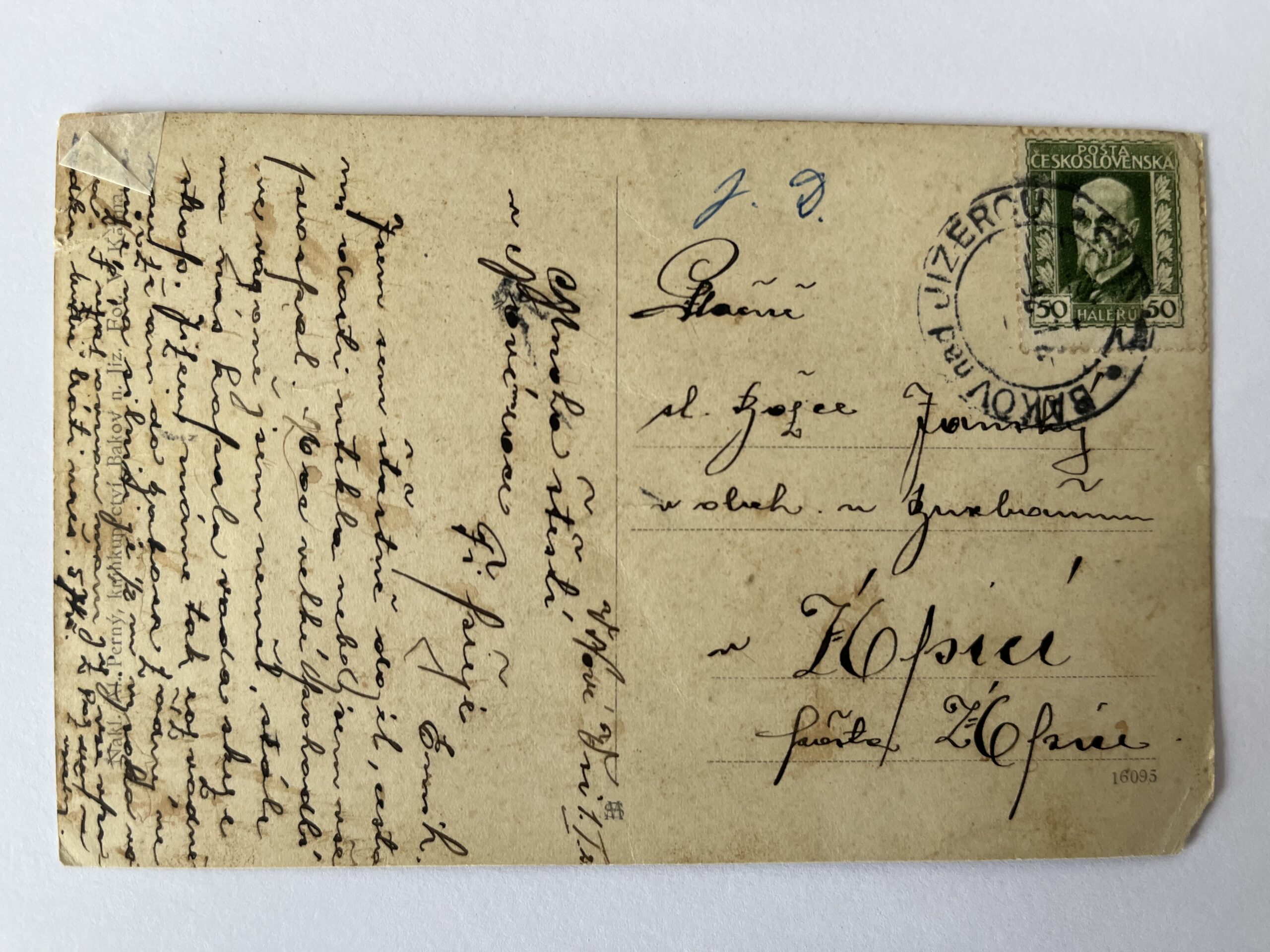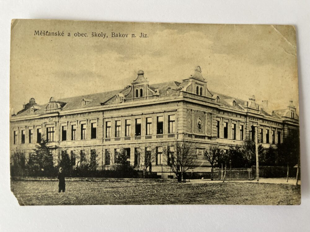 (Mladá Boleslav-36) Pohlednice malý formát, prošlá poštou. Měšťanské a obec. školy, Bakov nad Jizerou. Okres Mladá Boleslav. Jeden růžek lepen, druhý utržen.