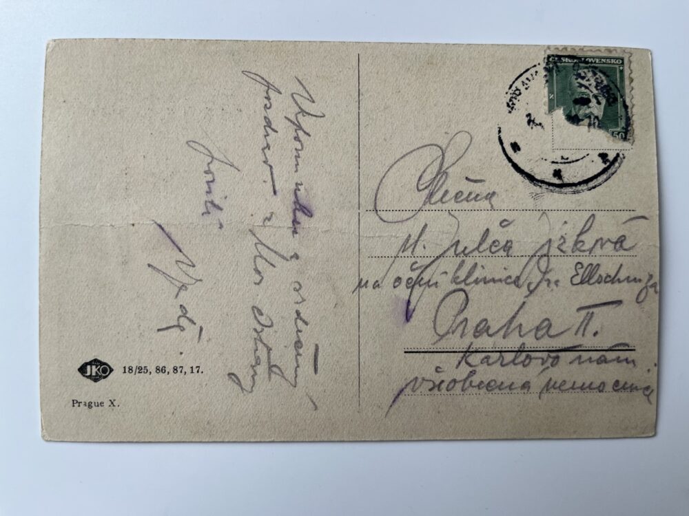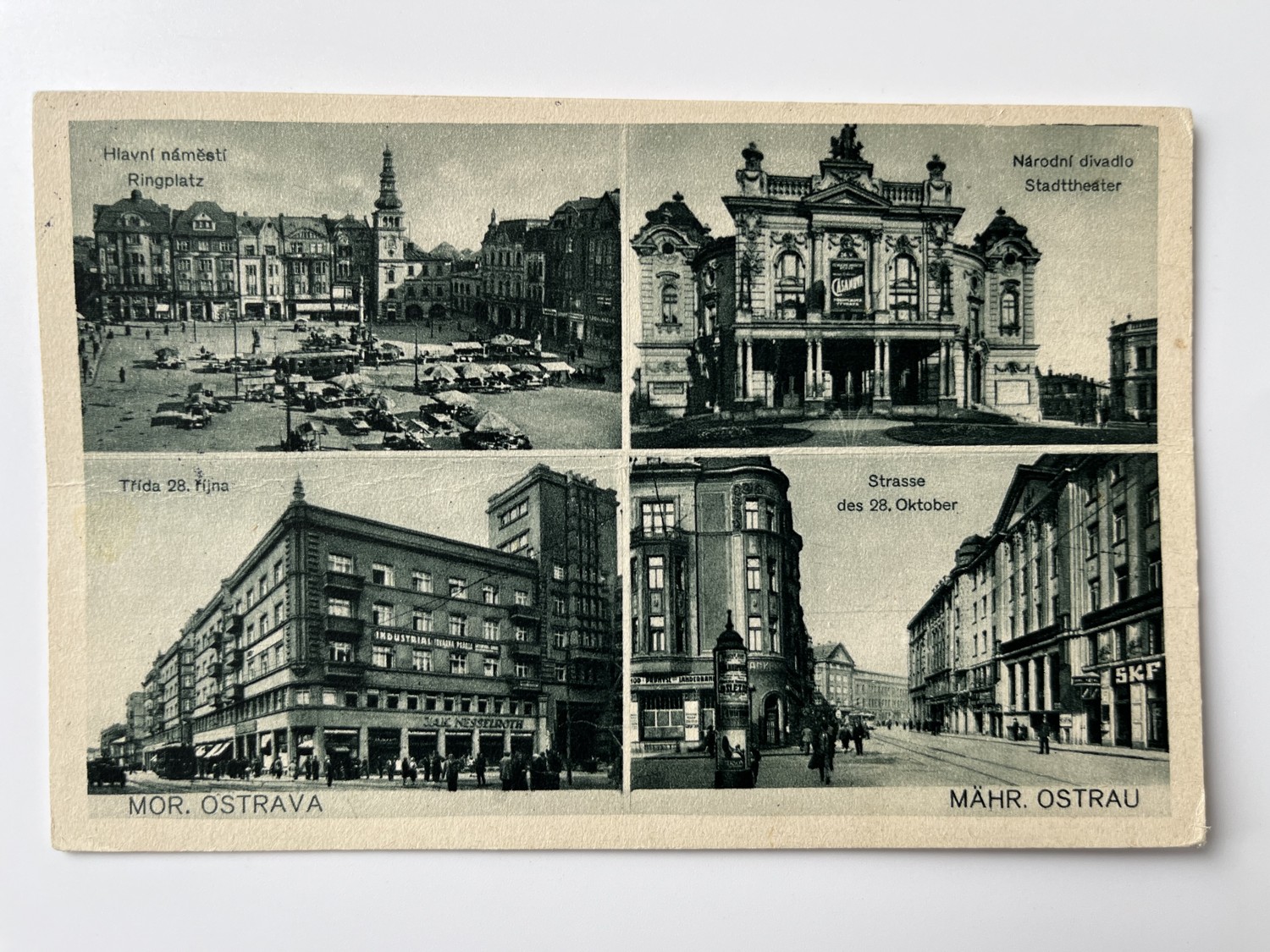 (Ostrava-42) Pohlednice malý formát, prošlá poštou. Moravská Ostrava, koláž – Hlavní náměstí. Národní divadlo. Třída 28.října. Pohlednice v polovině mírně zlomená.