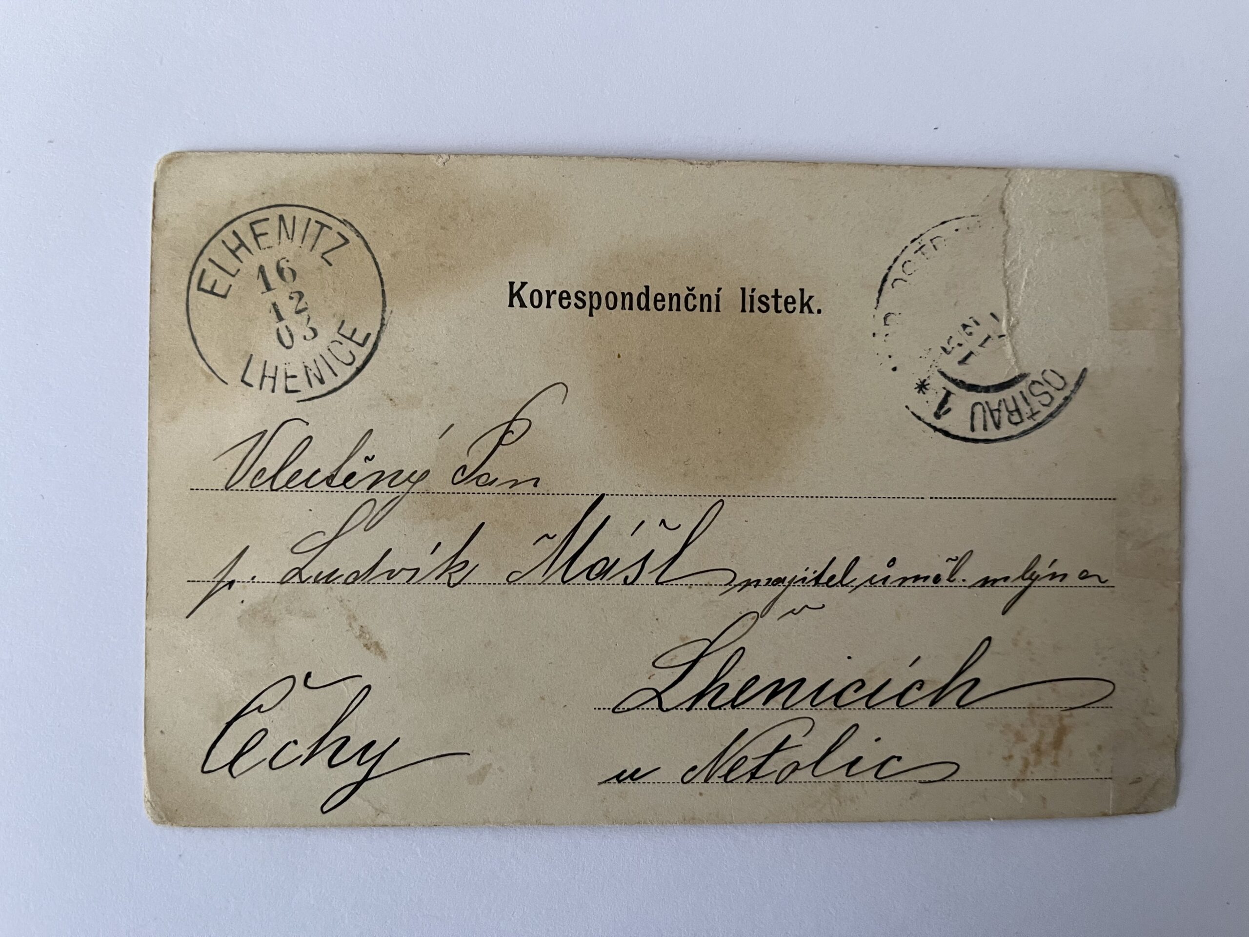 (Ostrava-město-42) Pohlednice malý formát, prošlá poštou, 1903. Adresát: majitel mlýna v Lhenicích u Netolic