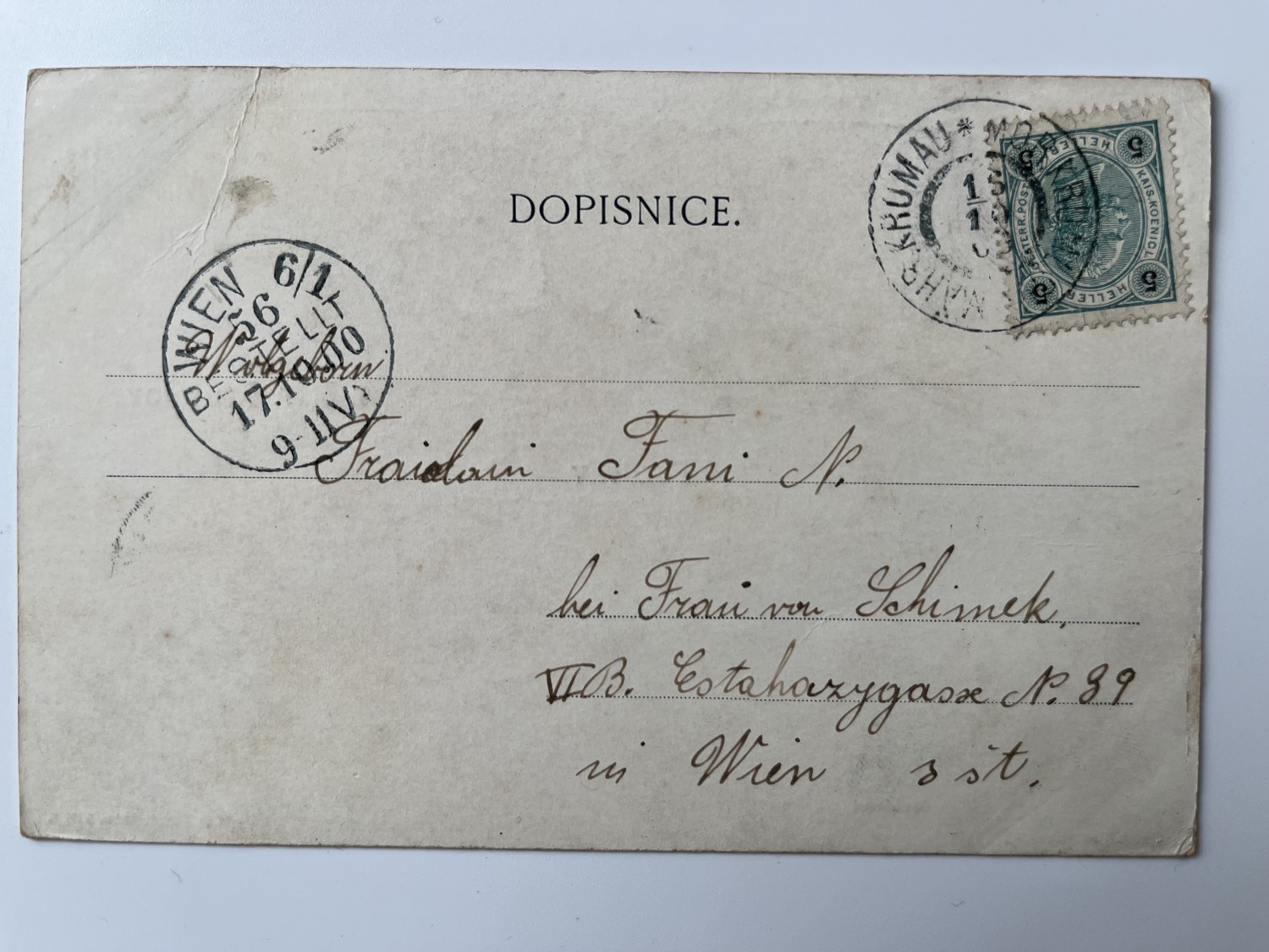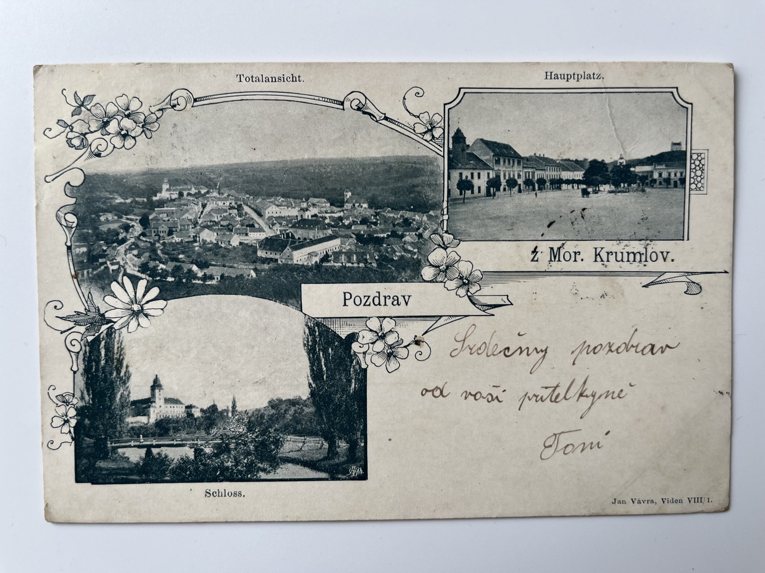 (Znojmo-49) Pohlednice malý formát, prošlá poštou. Moravský Krumlov – koláž – Hlavní náměstí. Celkový pohled. Zámek.