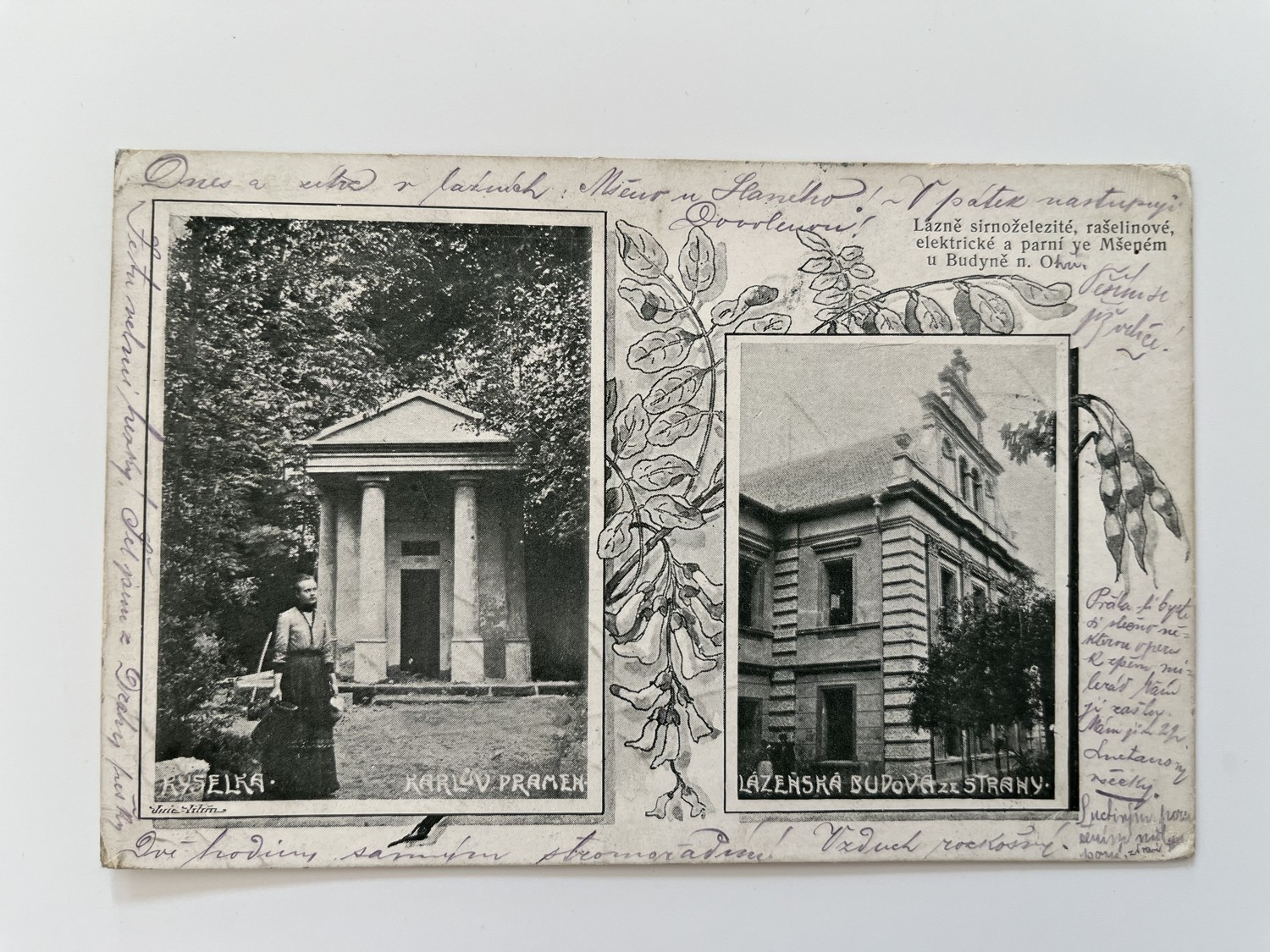 (Litoměřice-58) Pohlednice malý formát, prošlá poštou. Mšené u Budyně n.O. koláž – Kyselka – Karlův pramen. Lázeňská budova ze strany. Lázně sirnoželezité, rašelinové, elektrické a parní.