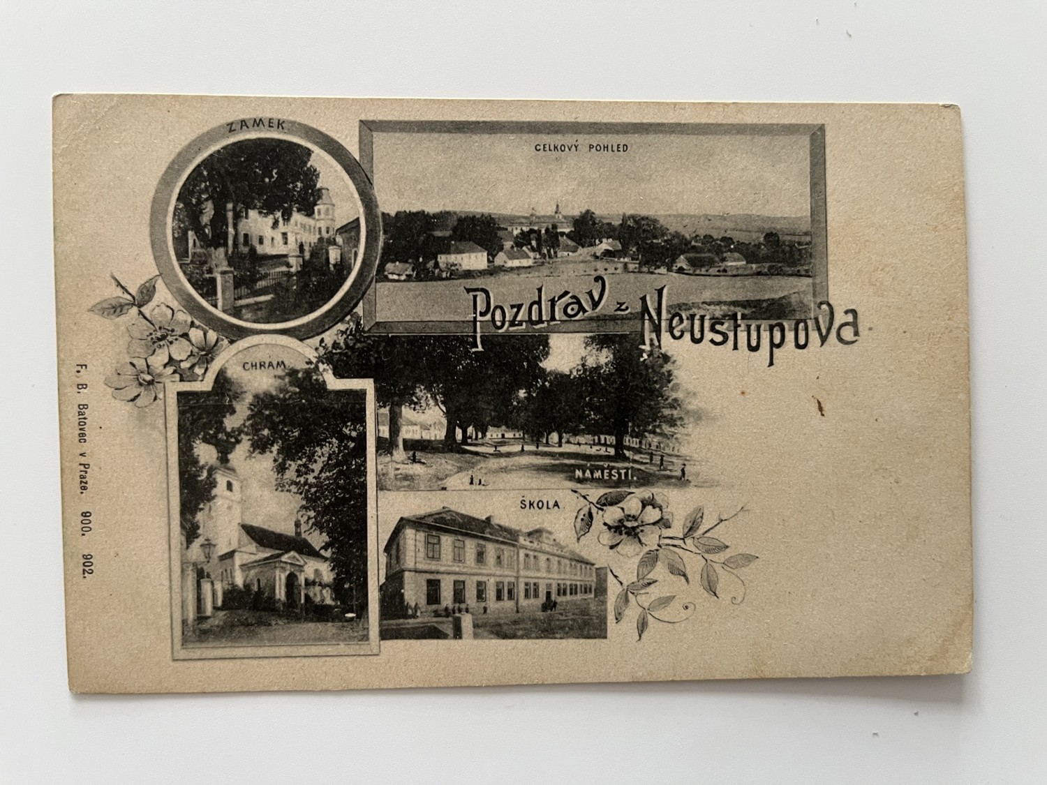 (Benešov-71) Pohlednice malý formát, čistá. Neustupov, koláž – Zámek. Chrám. Celkový pohled. Náměstí. Škola.