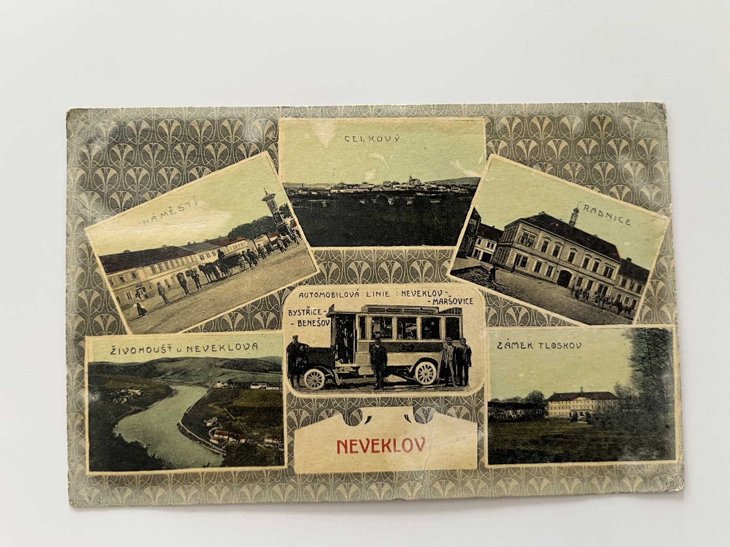 (Benešov-71) Pohlednice malý formát, prošlá poštou. Nevelkov – koláž – Celkový pohled. Náměstí. Radnice. Automobilová linie: Nevelkov – Maršovice, Bystřice – Benešov. Živohošť u Nevelkova. Zámek Tloskov.
