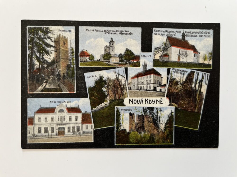 (Domažlice-60) Pohlednice malý formát, prošlá poštou. Nová Kdyně, r.1922 koláž – Radnice. Hotel u Bílého lva. Rýzmberk. Poutní kostel u sv. Anny na Tannaberku. Kostelík sv.Václava. Netřeb. Zřícenina hradu Herštejn.