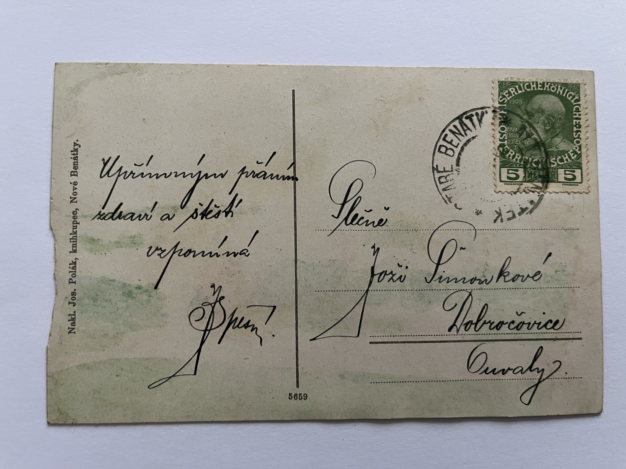 (Mladá Boleslav 36) Pohlednice malý formát, prošlá poštou. Pohlednice na jedné straně mírně utržená, viz foto.