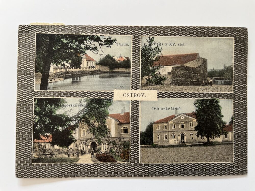 (Karlovy Vary-63) Pohlednice malý formát, prošlá poštou. Ostrov, koláž – Partie. Bašta z XV. stol. Ostrovské lázně.
