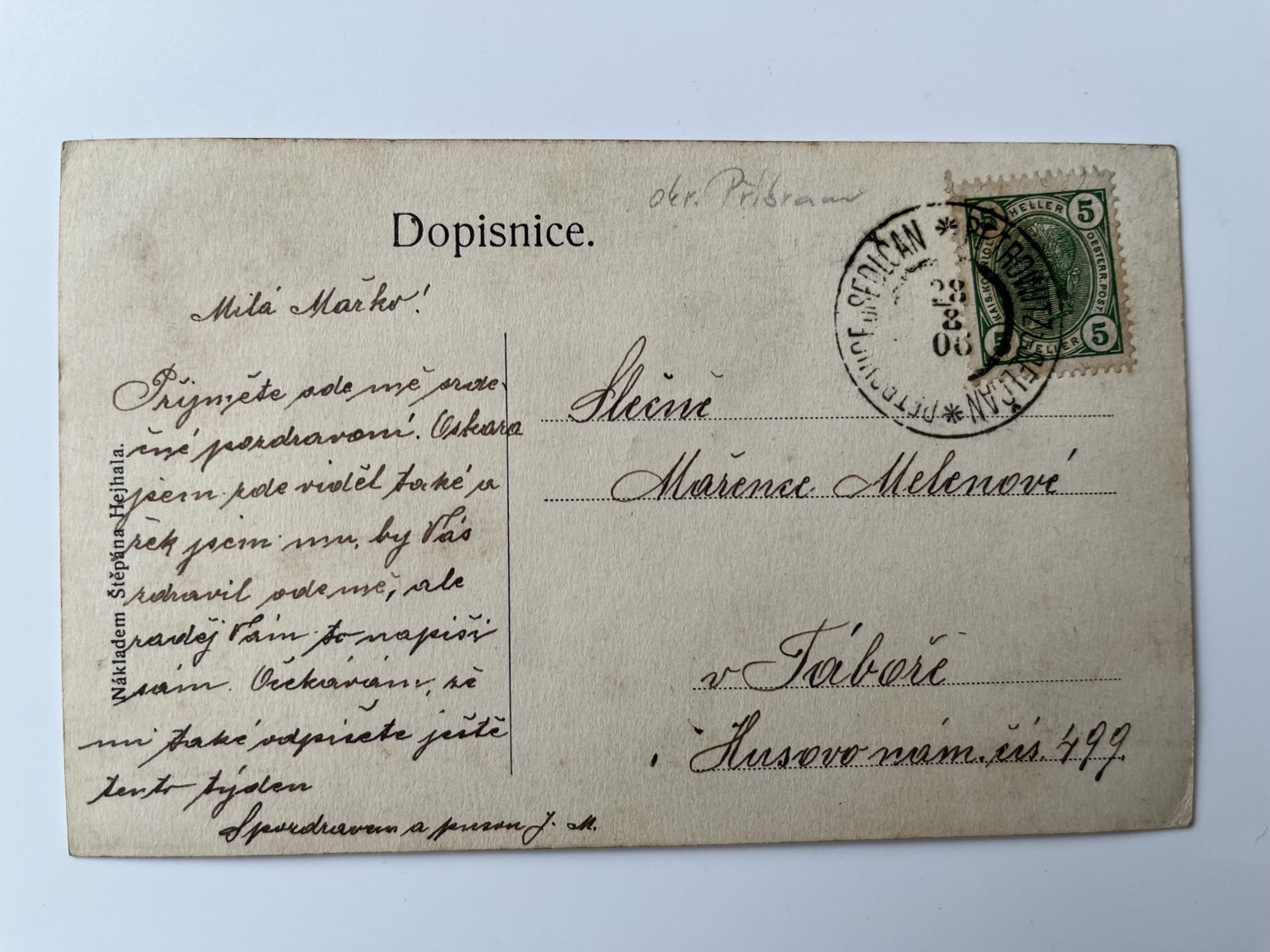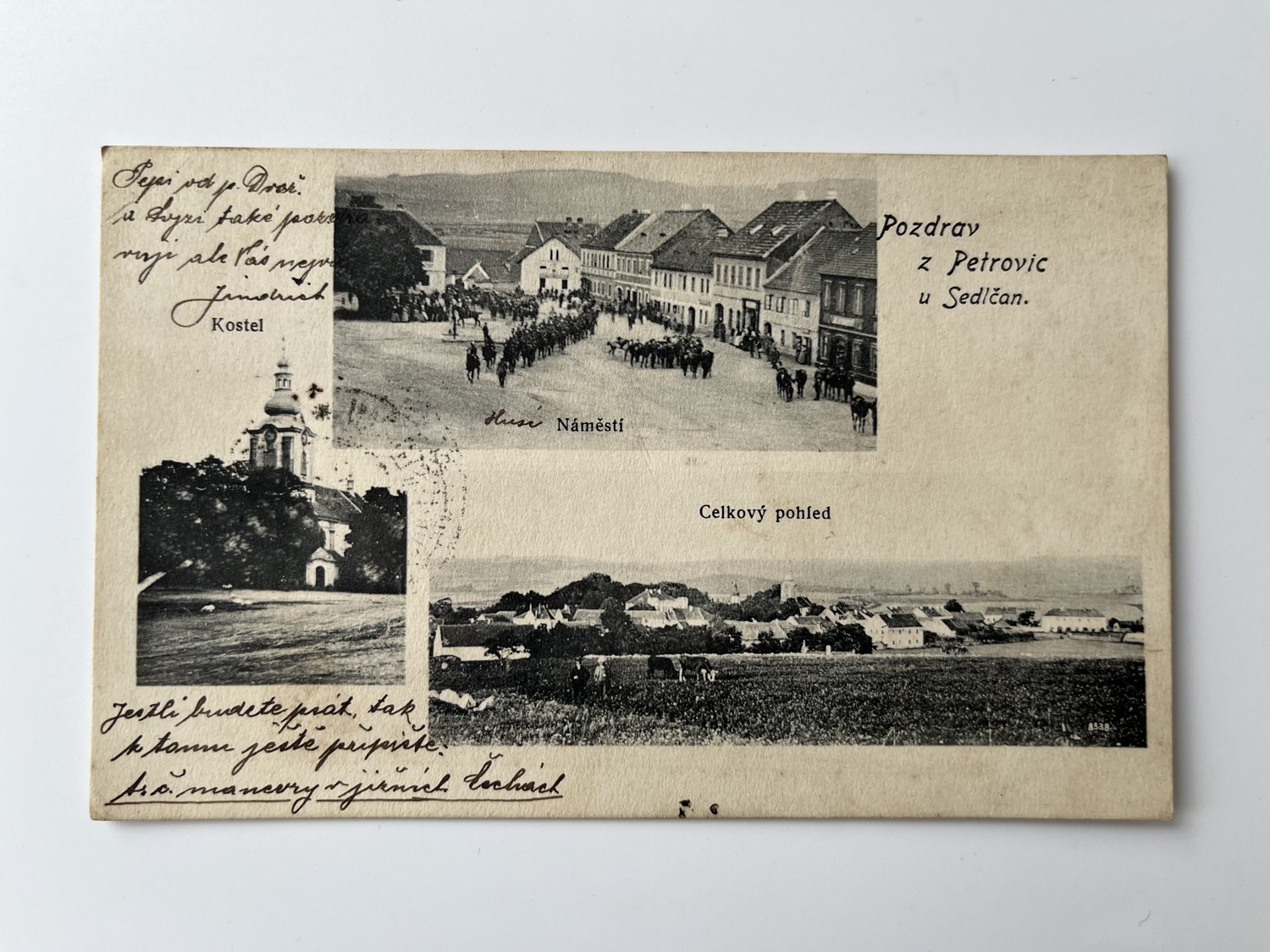 (Příbram-29) Pohlednice malý formát, prošlá poštou. Petrovice u Sedlčan – Kostel. Náměstí. Celkový pohled.