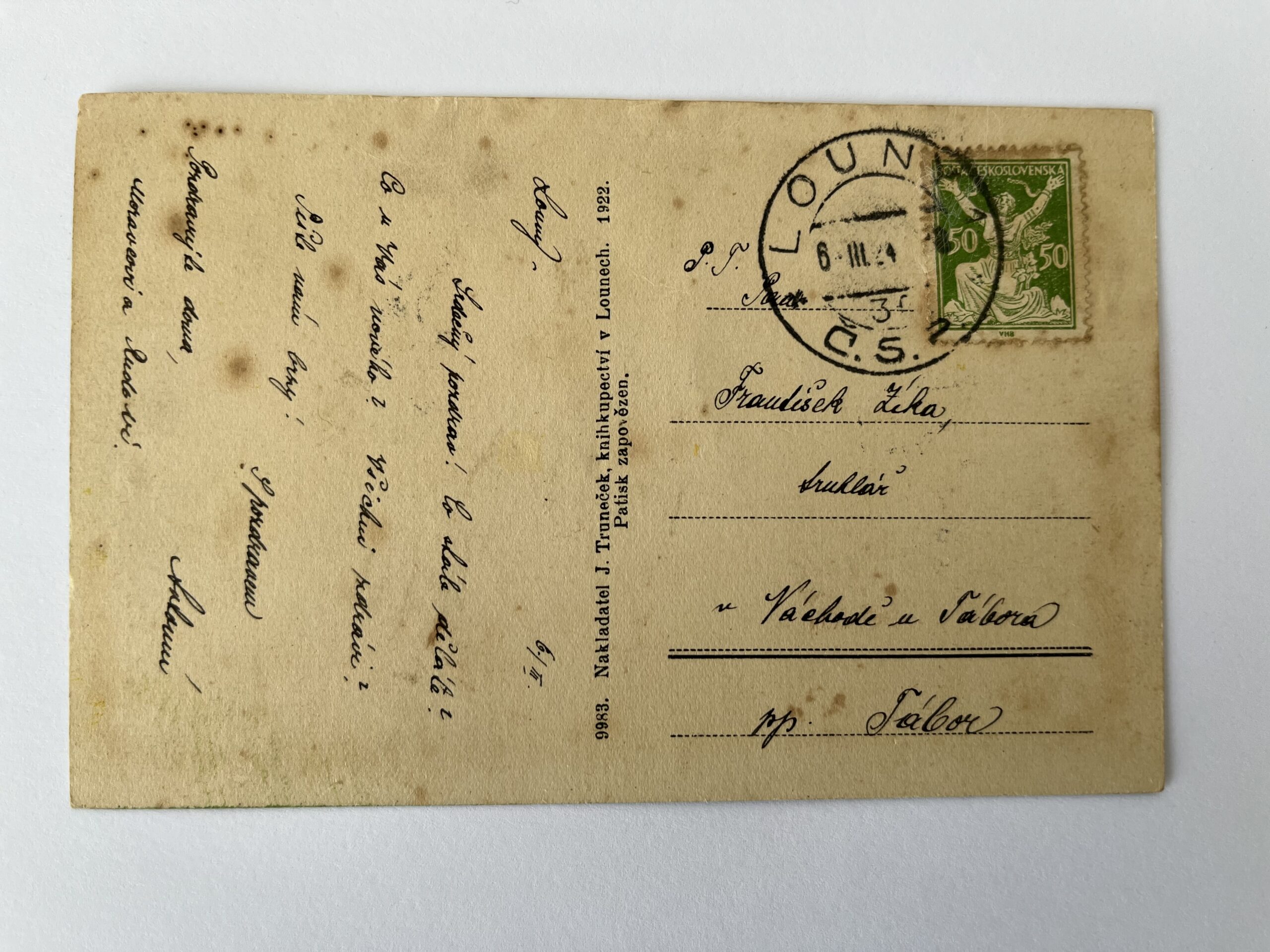 (Louny-50) Pohlednice malý formát, prošlá poštou. Adresát truhlář v Náchodě u Tábora, 1924.