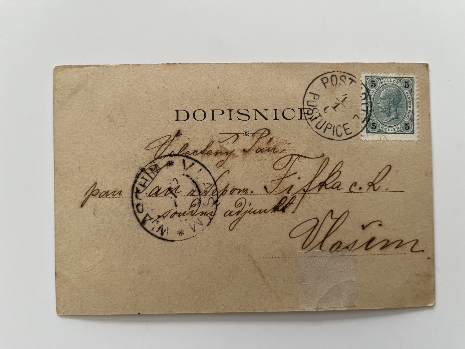 (Benešov-71) Pohlednice malý formát, prošlá poštou. Pozdrav z Postupic! Pozvání na taneční zábavu – Dne 7.ledna 1900 pořádáme taneční zábavu v národních krojích.