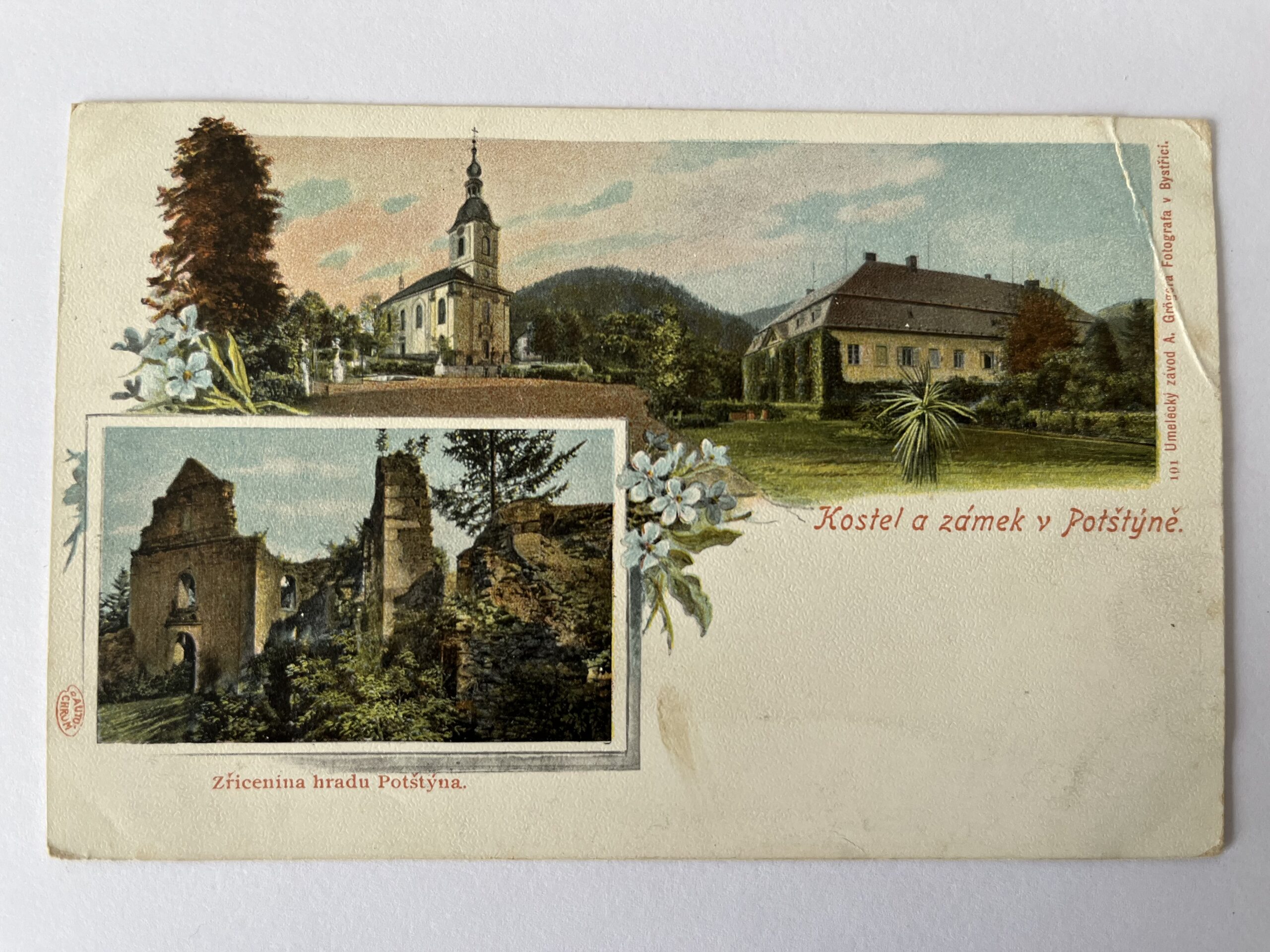(Rychnov nad Kněžnou-35) Pohlednice malý formát, neprošlá poštou. Roh pohlednice zlomený. Kostel a zámek v Potštýně. Zřícenina hradu Potštýna. Koláž.
