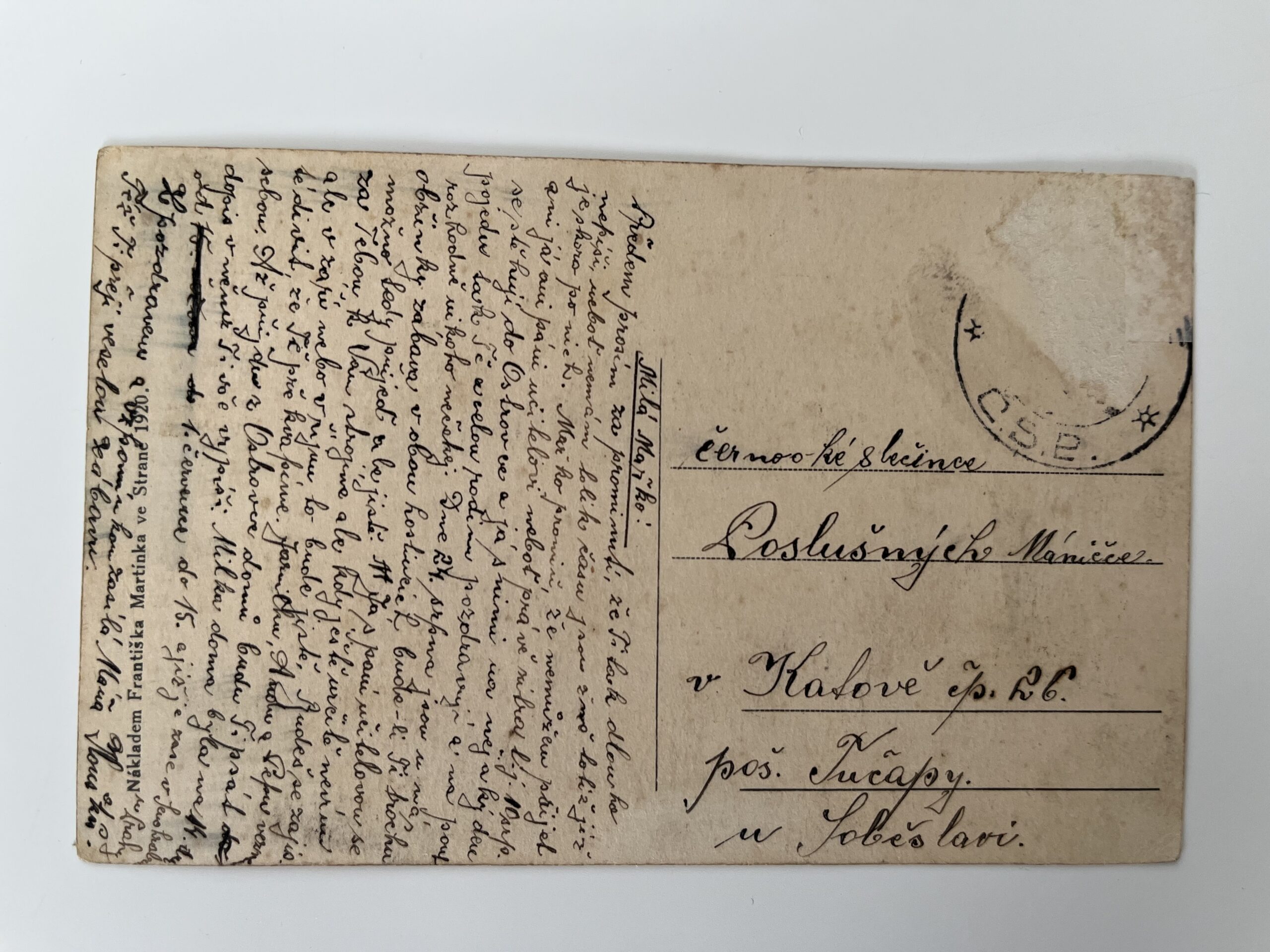 (Pelhřimov hhv) Pohlednice malý formát, prošlá poštou. Nákladem Františka Martínka ve Strané 1920.