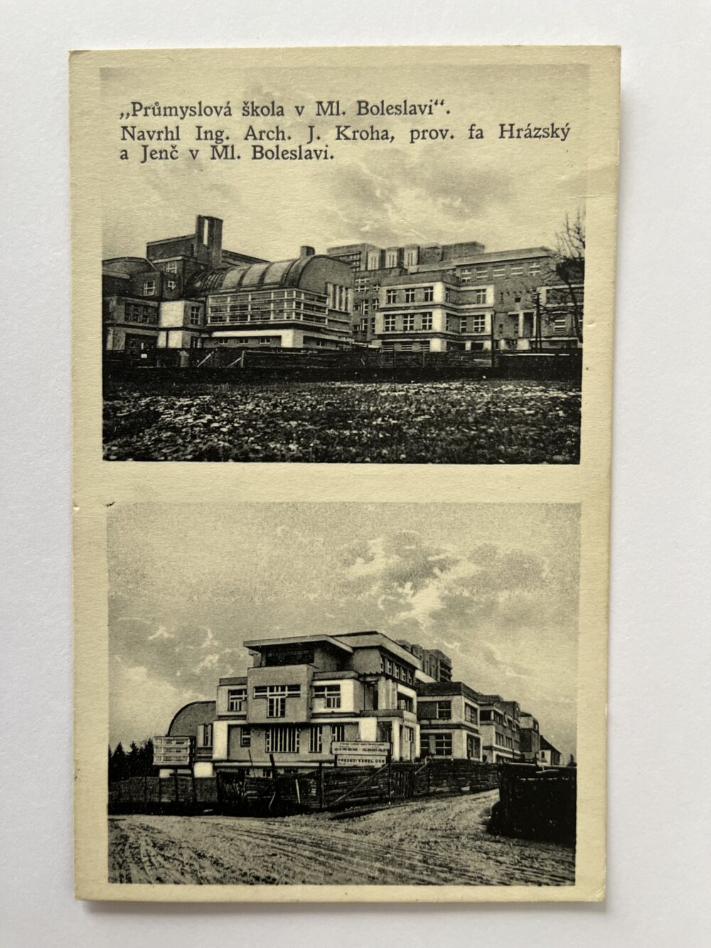 (Mladá Boleslav-36) Pohlednice malý formát, prošlá poštou. Průmyslová škola v Mladé Boleslavi. Navrhl Ing. Arch. J. Kroha, prov. a fa Hrázský a Jenč v Mladé Boleslavi.