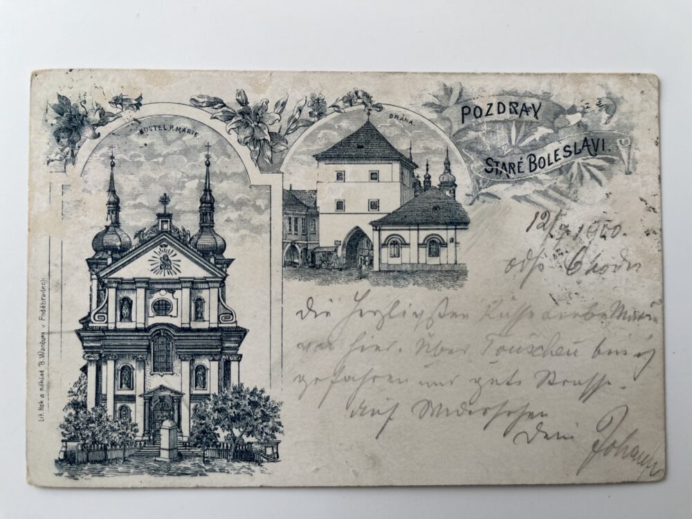 (Praha-východ-22) Pohlednice malý formát, prošlá poštou. Stará Boleslav – Kostel Nanebevzetí Panny Marie. Brána.