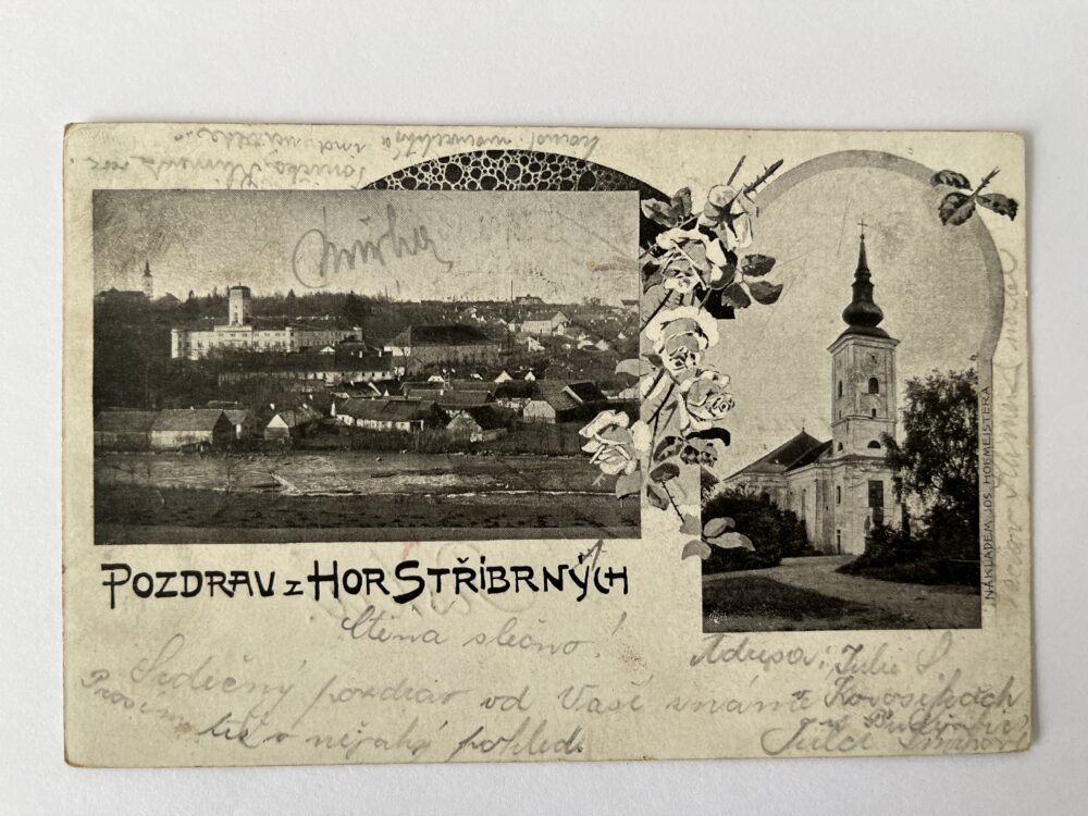 Pohlednice místopis Stříbrné Hory – celkový pohled, kostel koláž 1899
