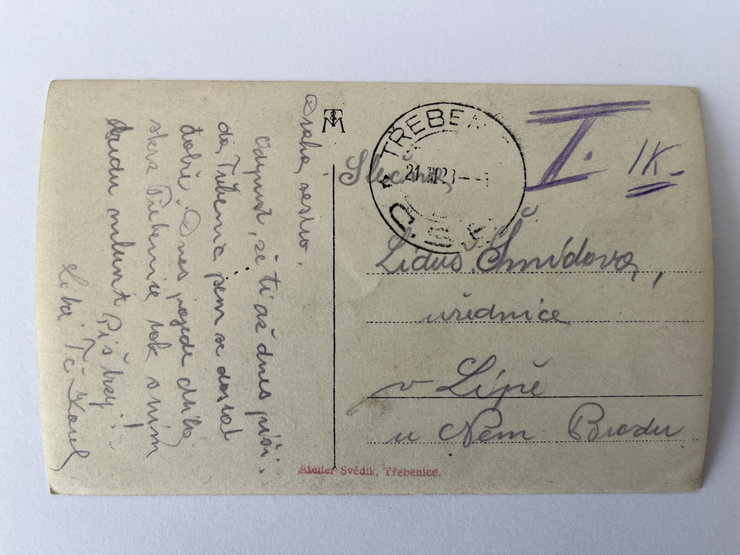 (Litoměřice-58) Pohlednice malý formát, prošlá poštou. Adresát: úřednice v Lípě u Něm. Brodu
