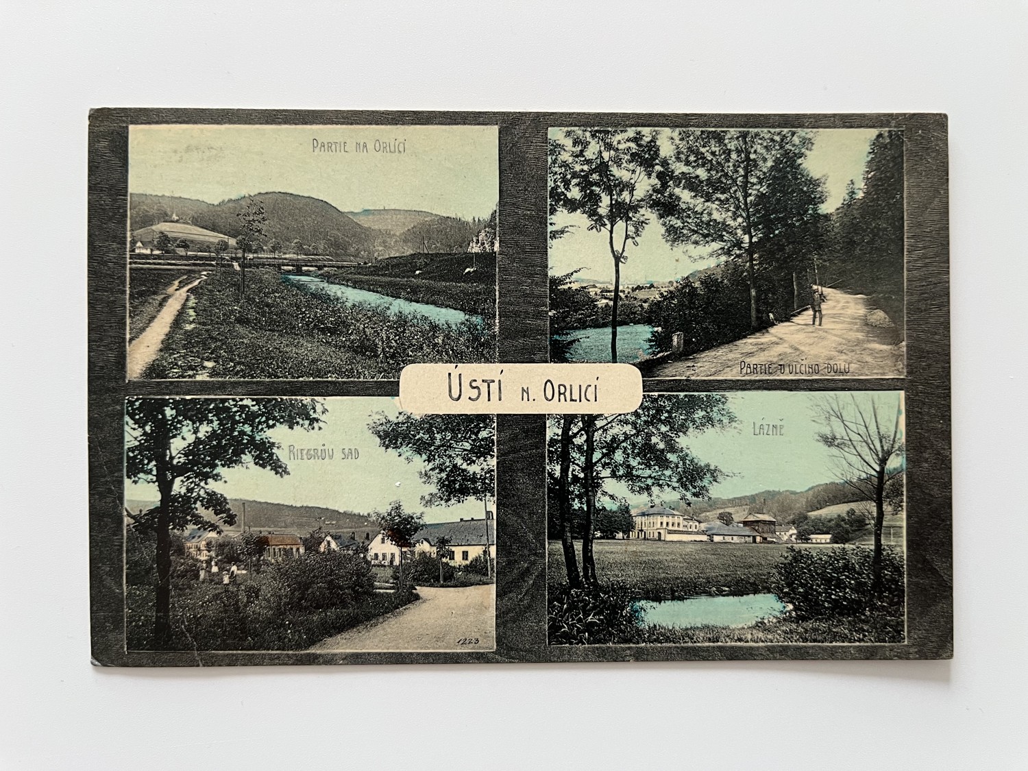 (Ústí nad Orlicí-72) Pohlednice malý formát, prošlá poštou. Koláž – Partie na Orlicí. Partie u Vlčího dolu. Riegrův sad. Lázně.