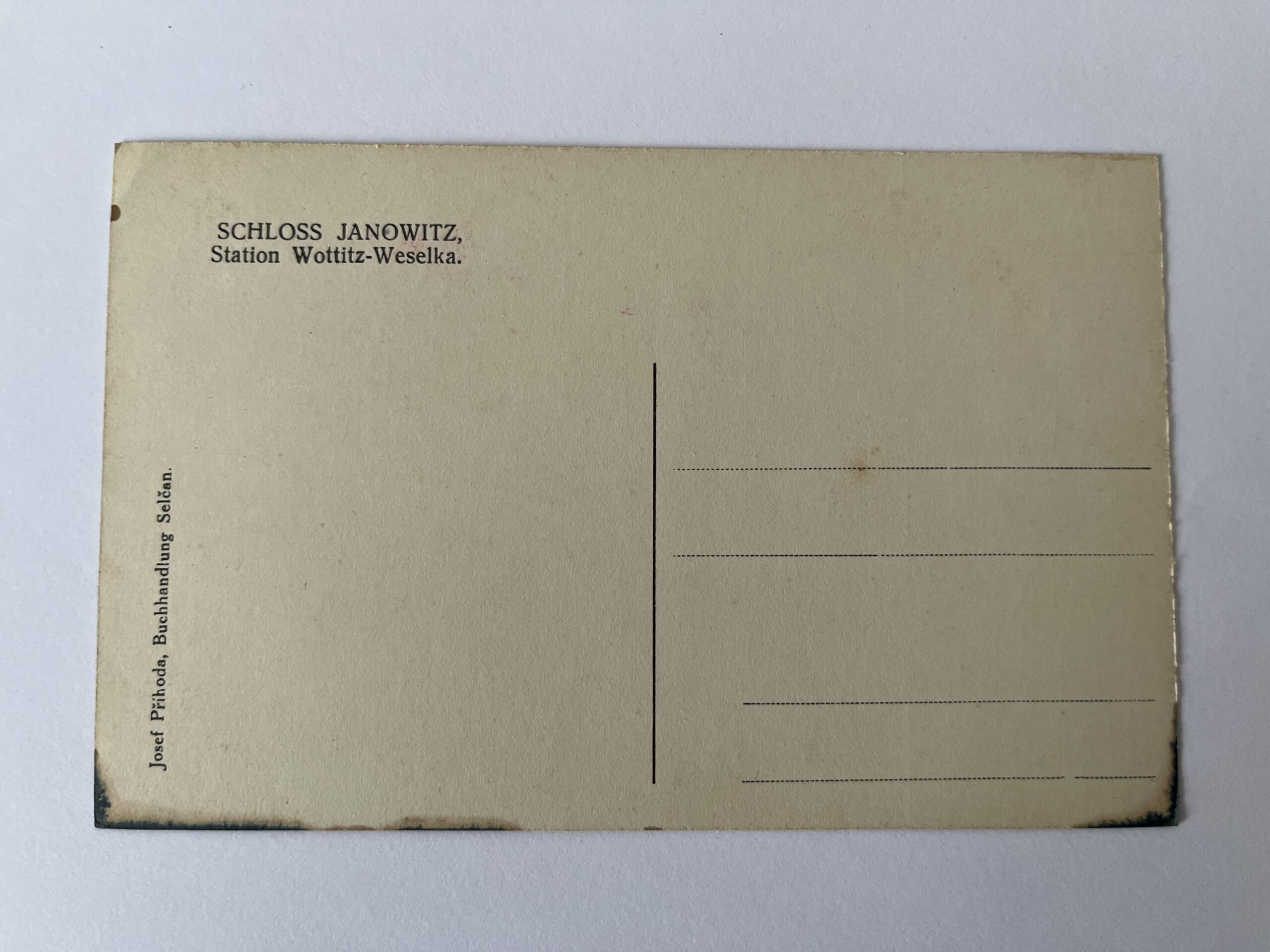 (Benešov-71) Pohlednice malý formát, neprošlá poštou. Vrchotovy Janovice – Schoss Janowitz. Station Wottitz-Weselka. Josef Příhoda. Buchhandlug, Selčan.
