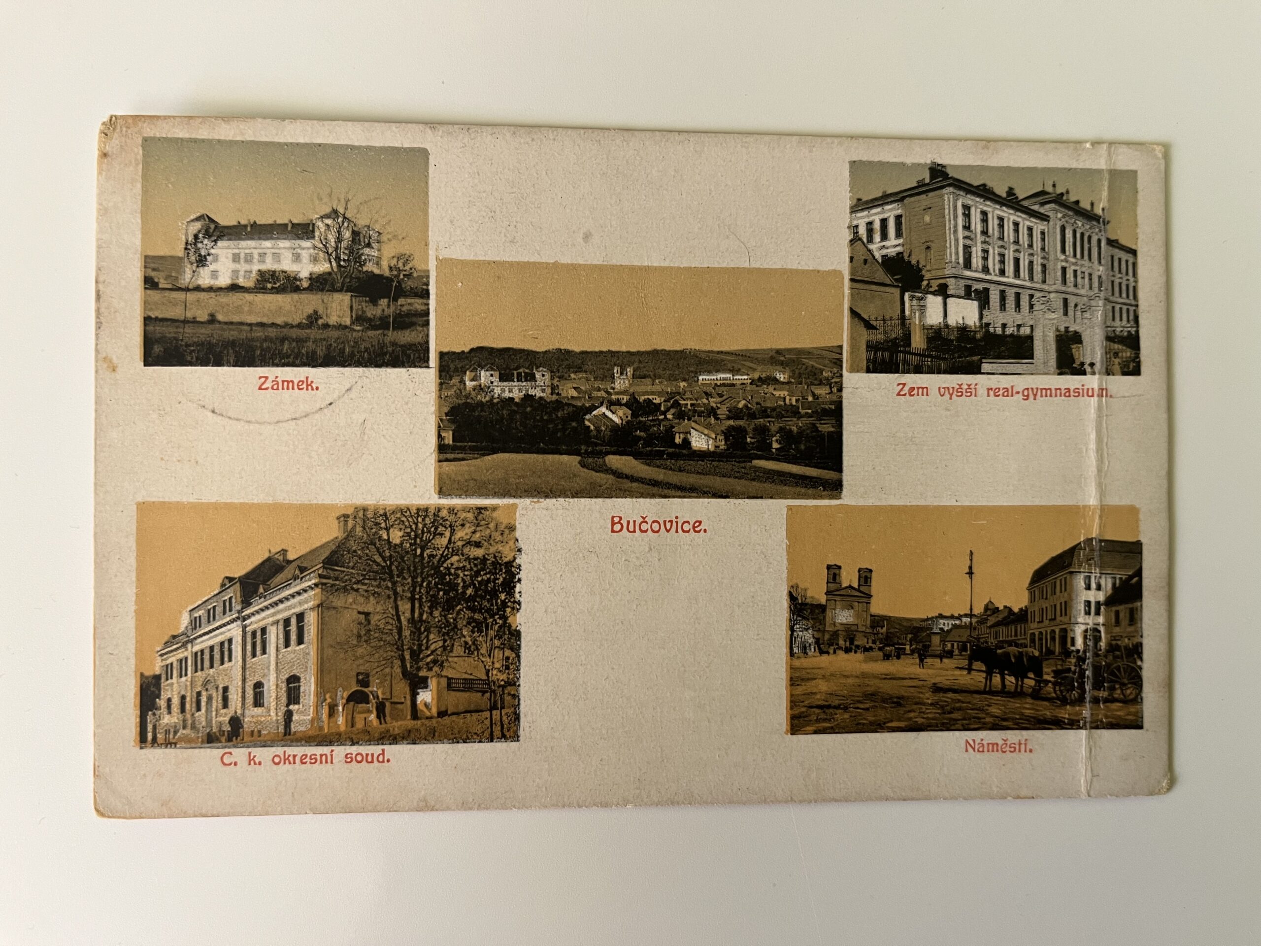 (Vyškov) Pohlednice malý formát, prošlá poštou. Koláž – Zámek. Bučovice. C.k. okresní soud. Zem.vyšší real.-gymnázium. Náměstí. Pohled je v jedné části zlomený, podlepený.