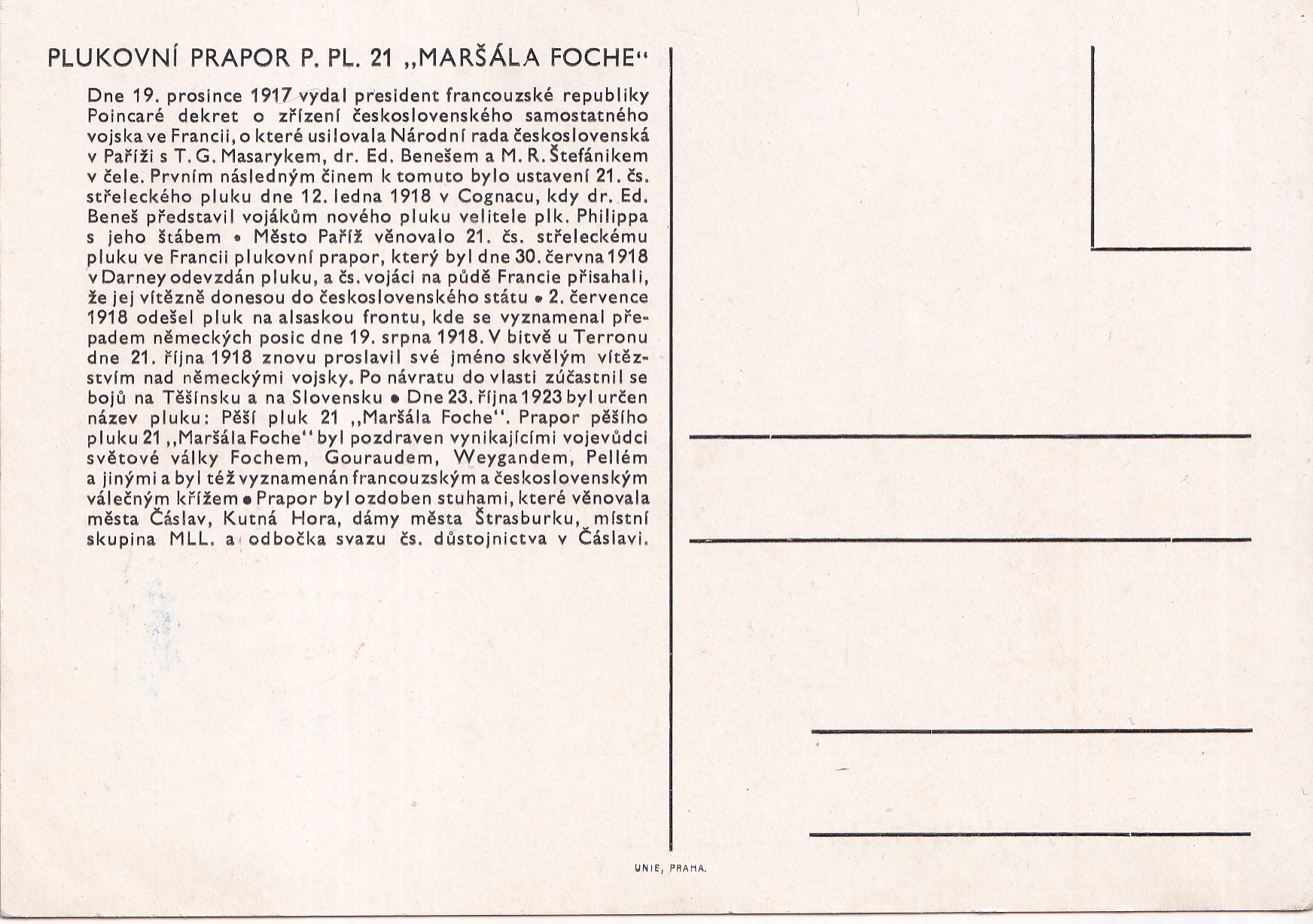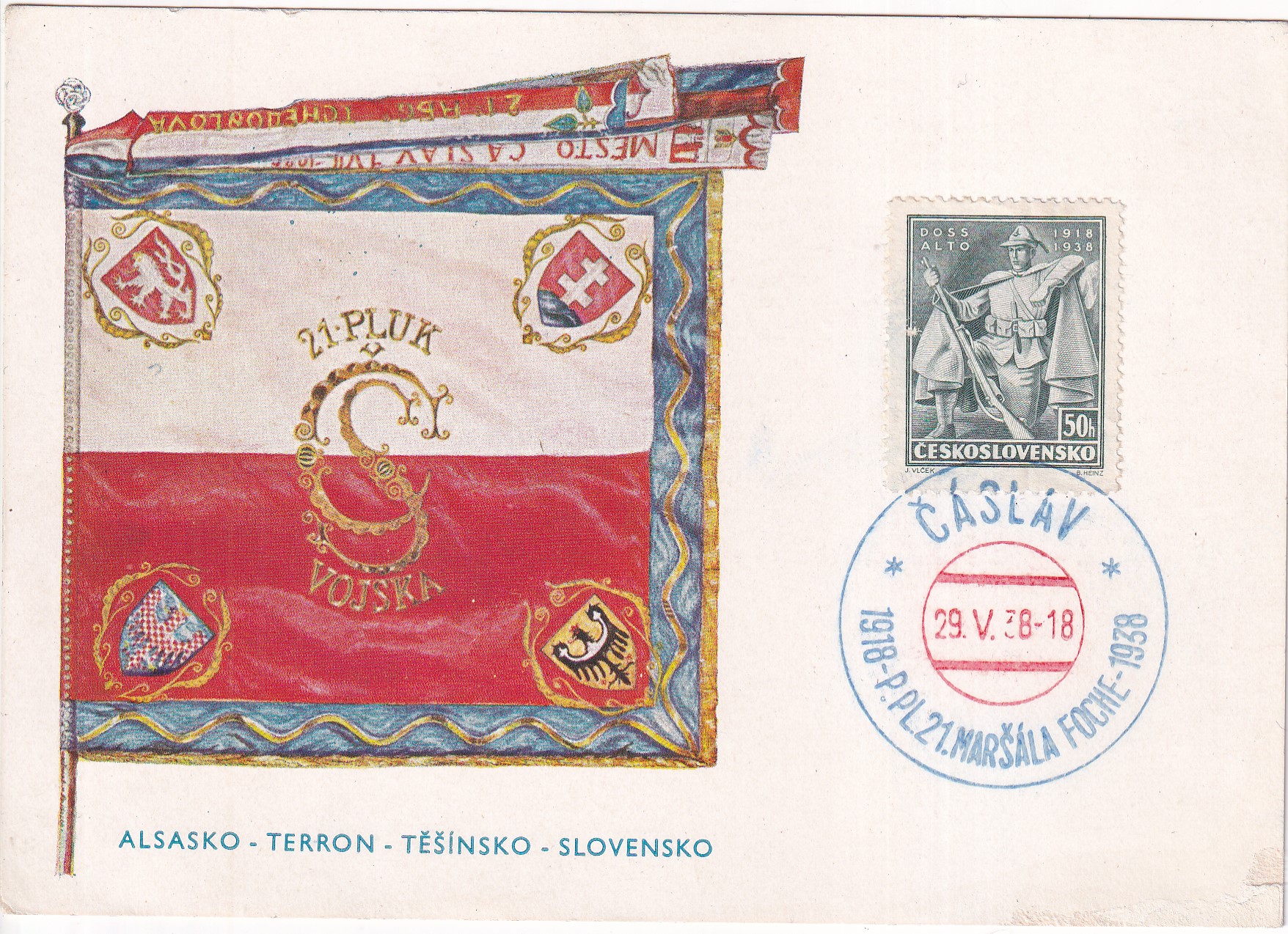22 (K3-2) Rozměr 10,5 x 15 cm. Propagační pohlednice Plukovní prapor P.PL 21 Maršála Foche. Alsasko-Terron-Těšínsko-Slovensko. Razítko Čáslav 29.V.1938 1918-P.PL21.Maršála Foche-1938