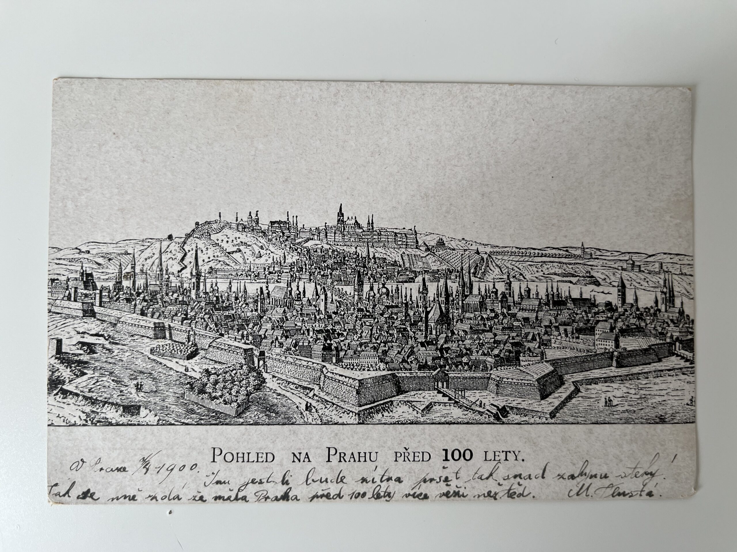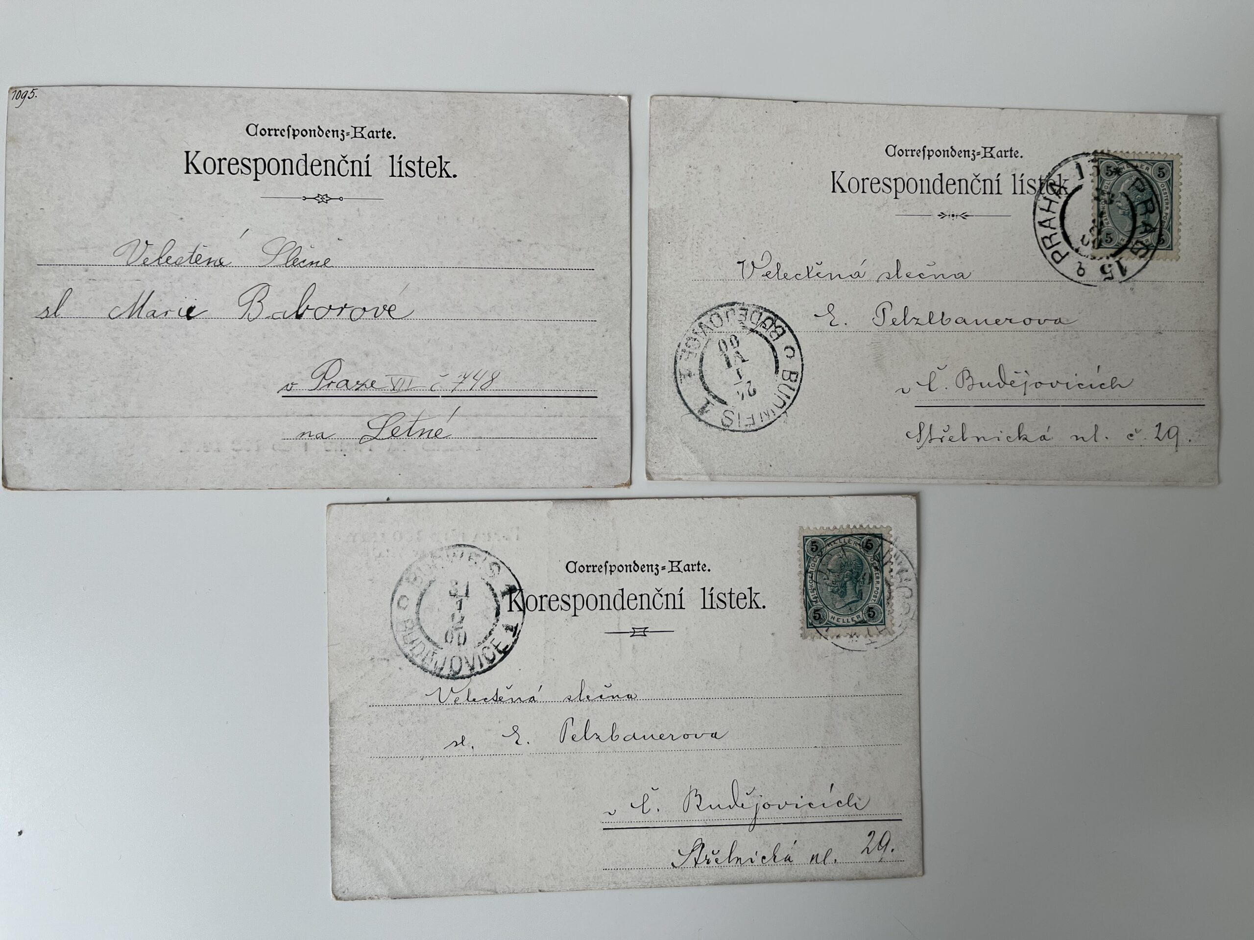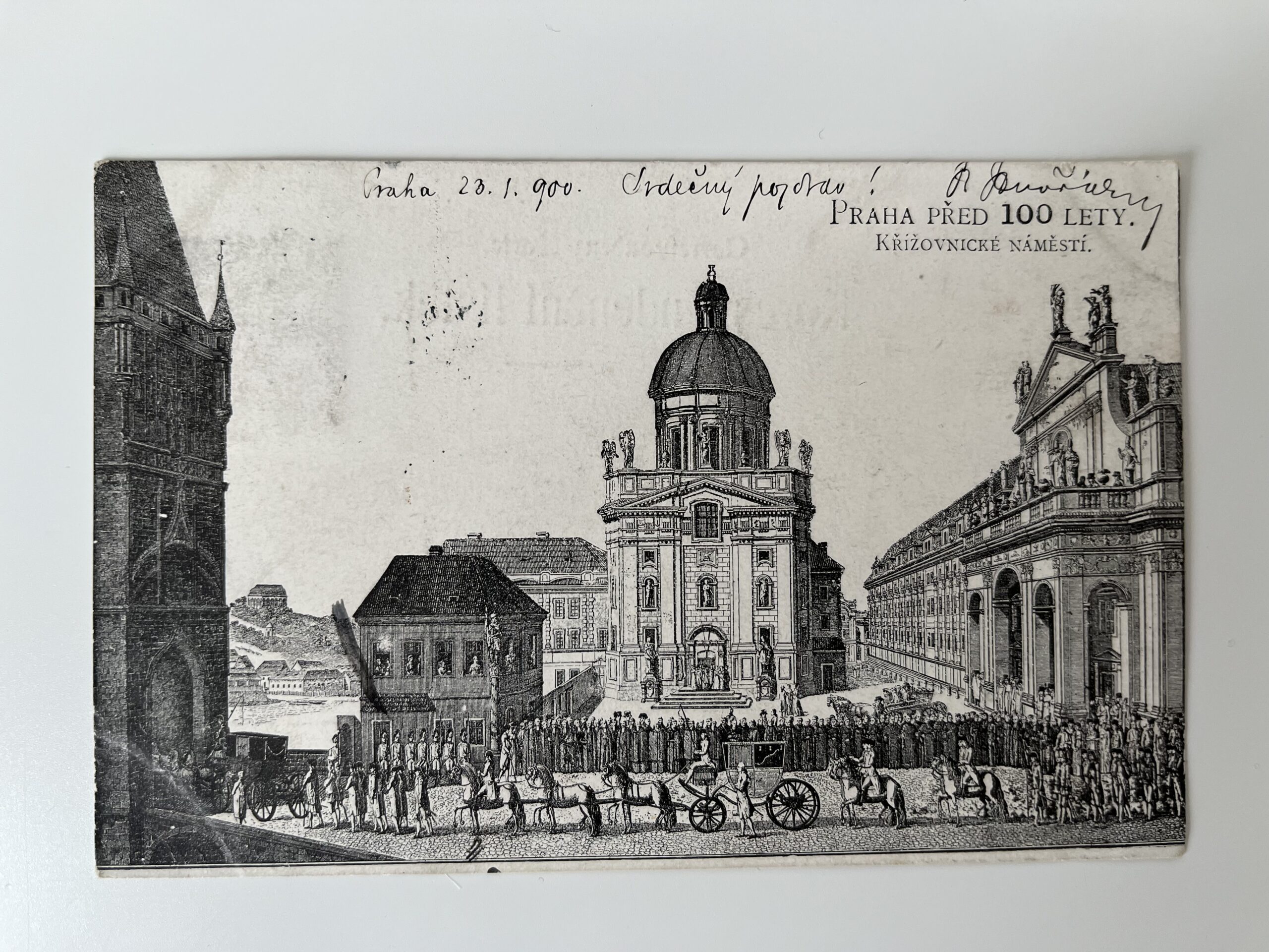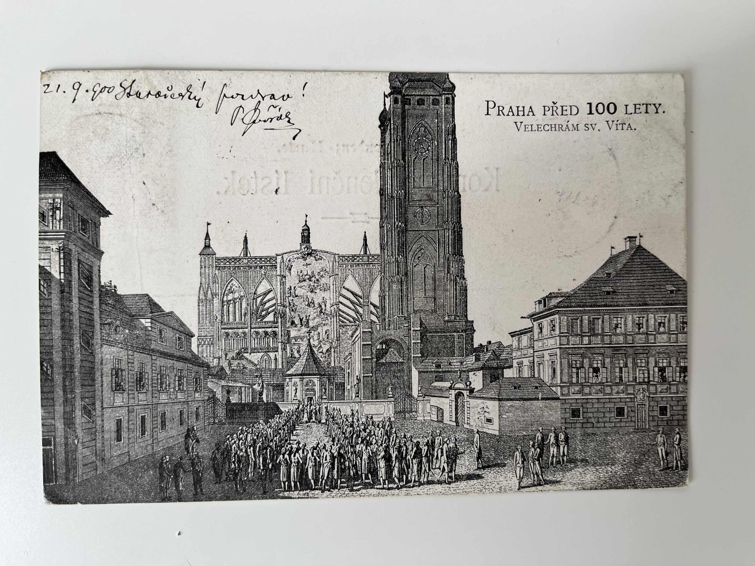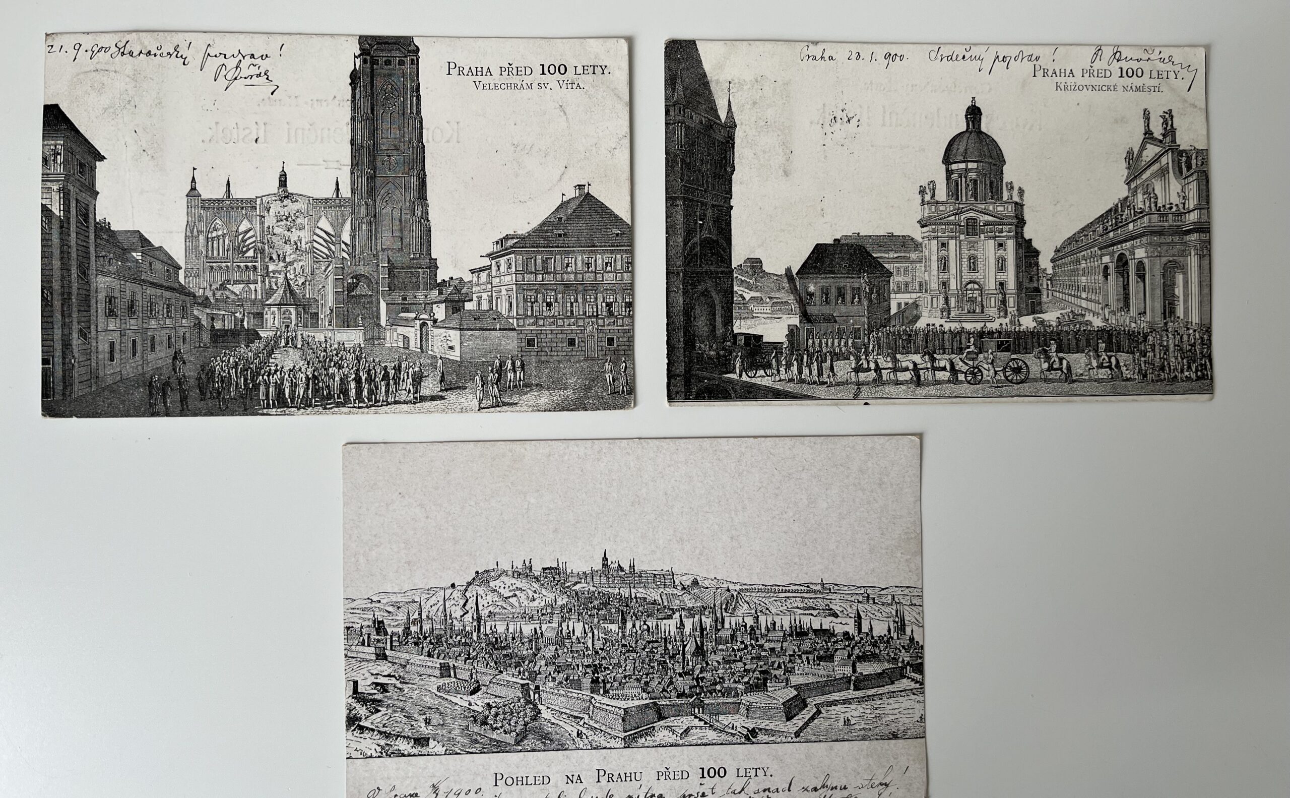 (Praha hhu) Pohlednice malý formát, prošlá poštou, r.1900. 3 ks Pohled na Prahu před 100 lety. Praha před 100 lety – Velechrám sv. Víta. Křižovnické náměstí .