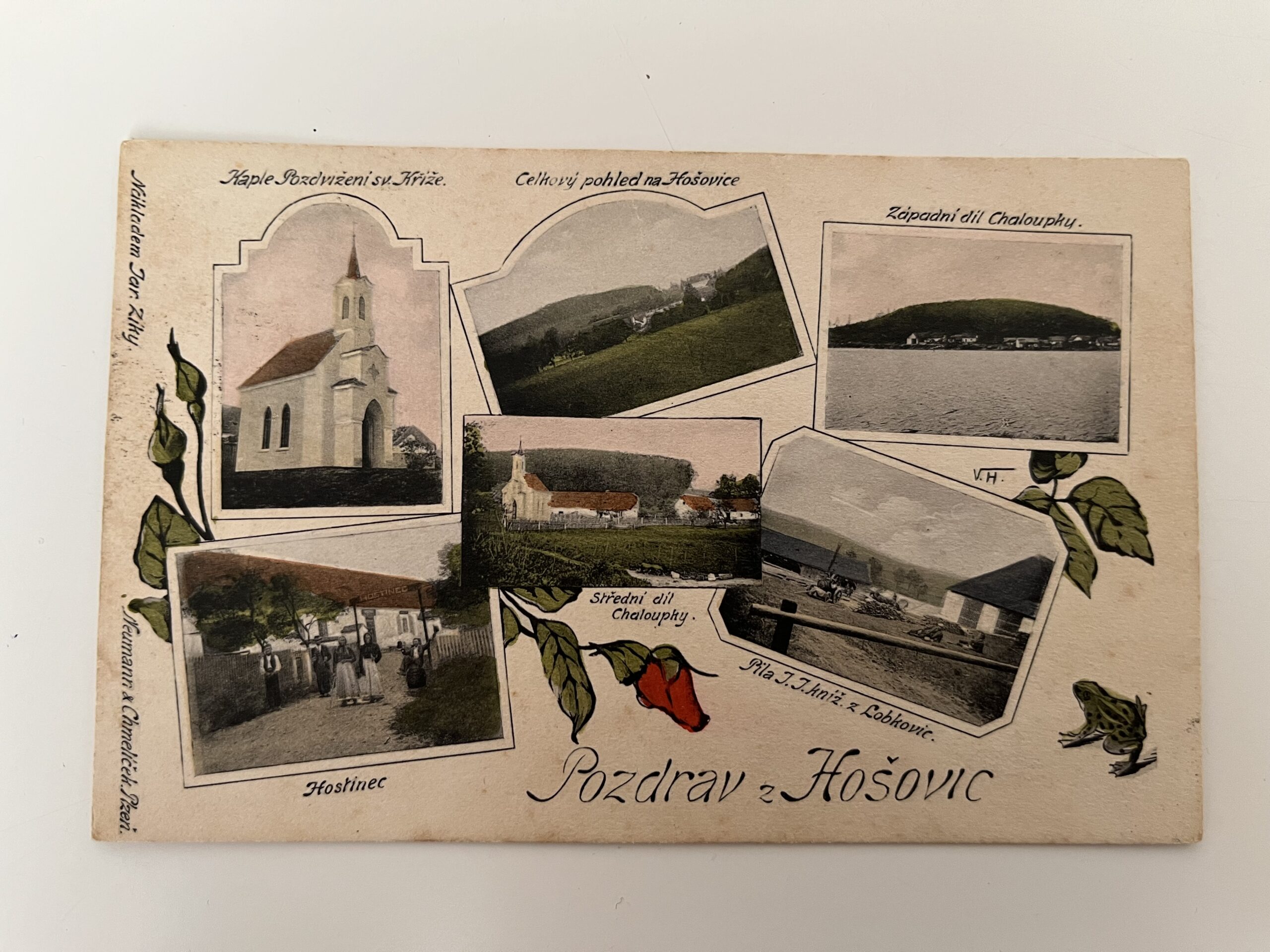 (Strakonice 40) Pohlednice malý formát, prošlá poštou. Koláž – Kaple Pozdvižení sv.Kříže. Celkový pohled na Hošovice. Západní díl chaloupky.Střední díl chaloupky. Pila. Hostinec. Neumann Chmelíček Plzeň.