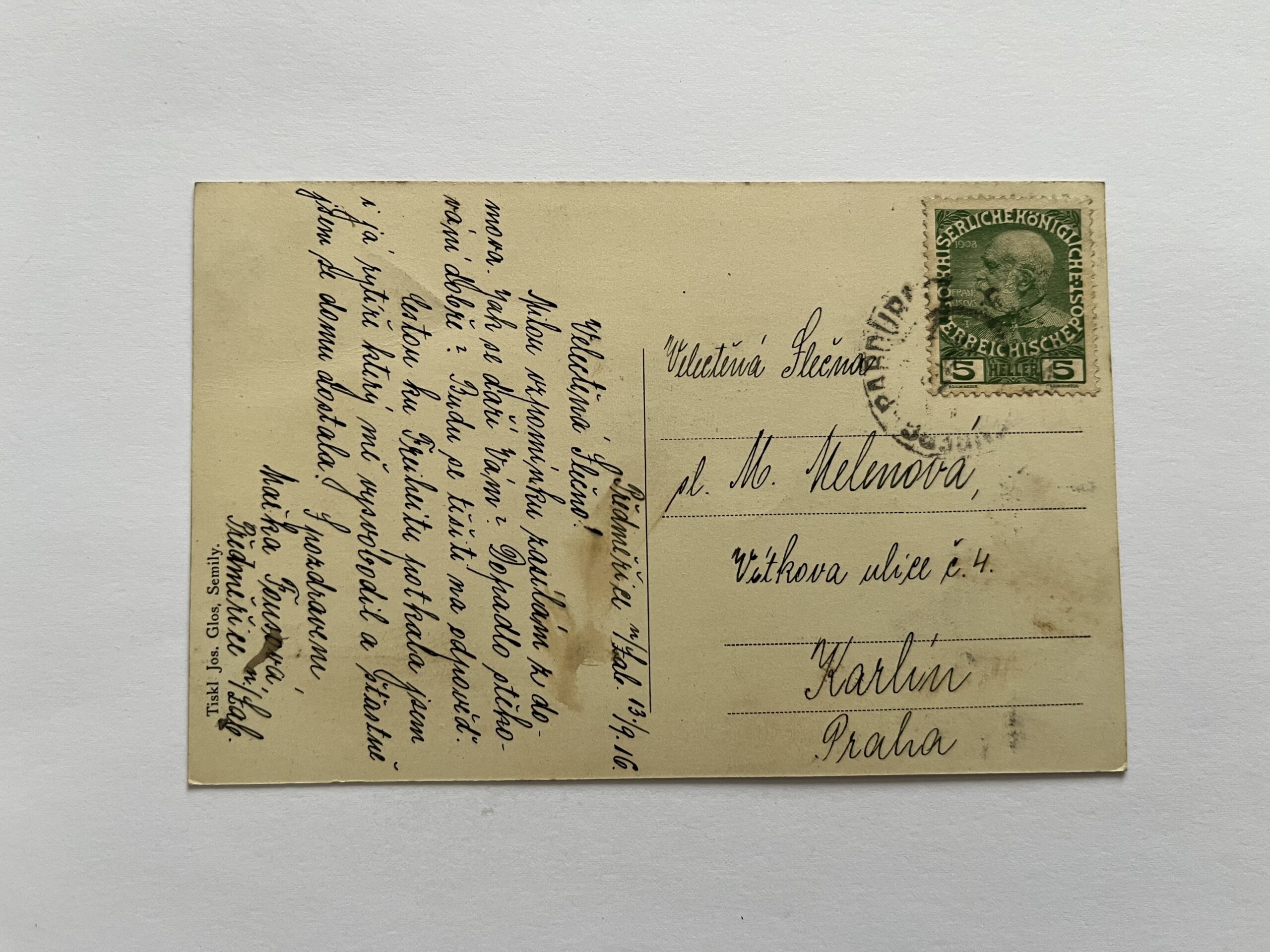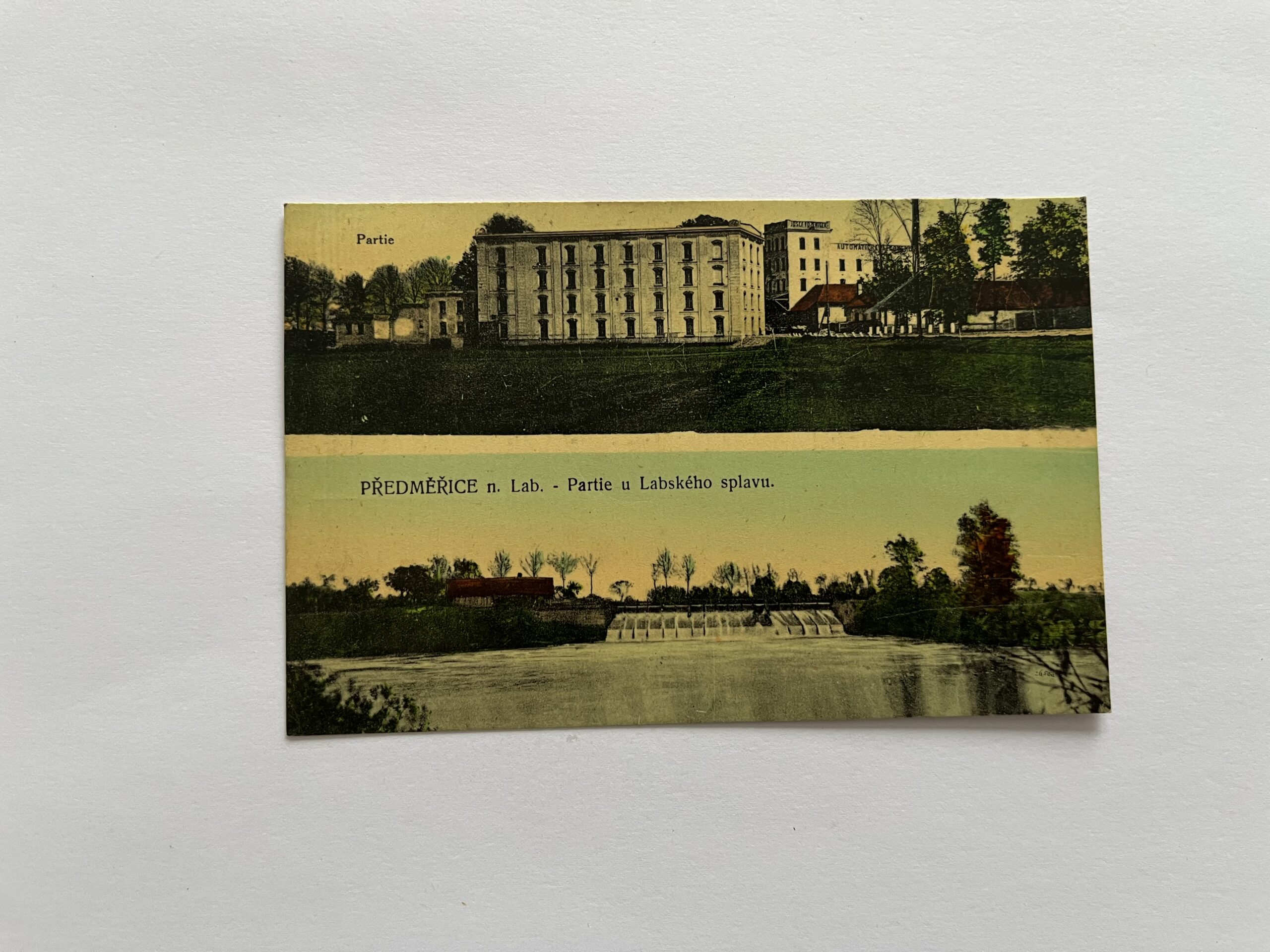 (Hradec Králové 68) Pohlednice malý formát, prošlá poštou, 1916. Předměřice nad Labem – Partie u Labského splavu, koláž. Okres Hardec Králové.