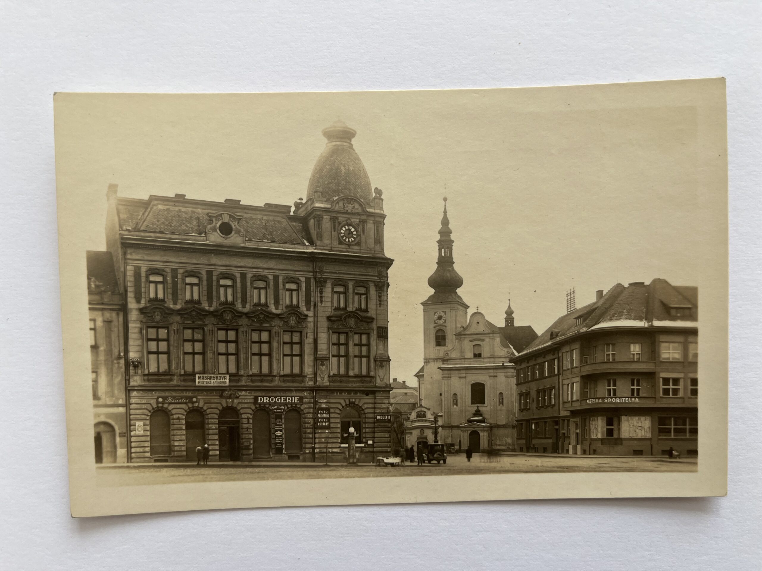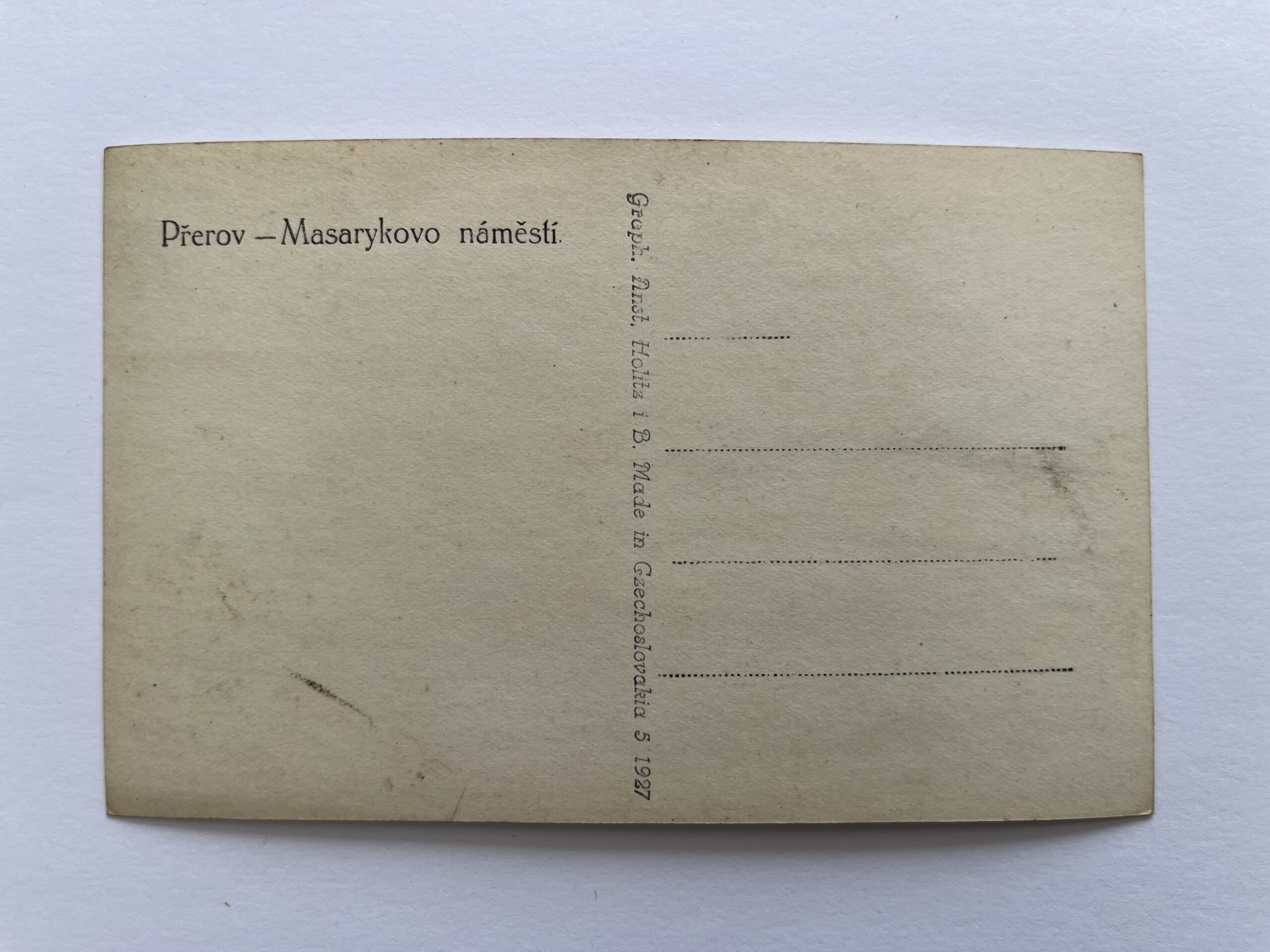 (Přerov-1) Pohlednice malý formát, neprošlá poštou. Přerov – Masarykovo náměstí – Drogerie. Masarykova městská knihovna. Městská spořitelna. Automobil…