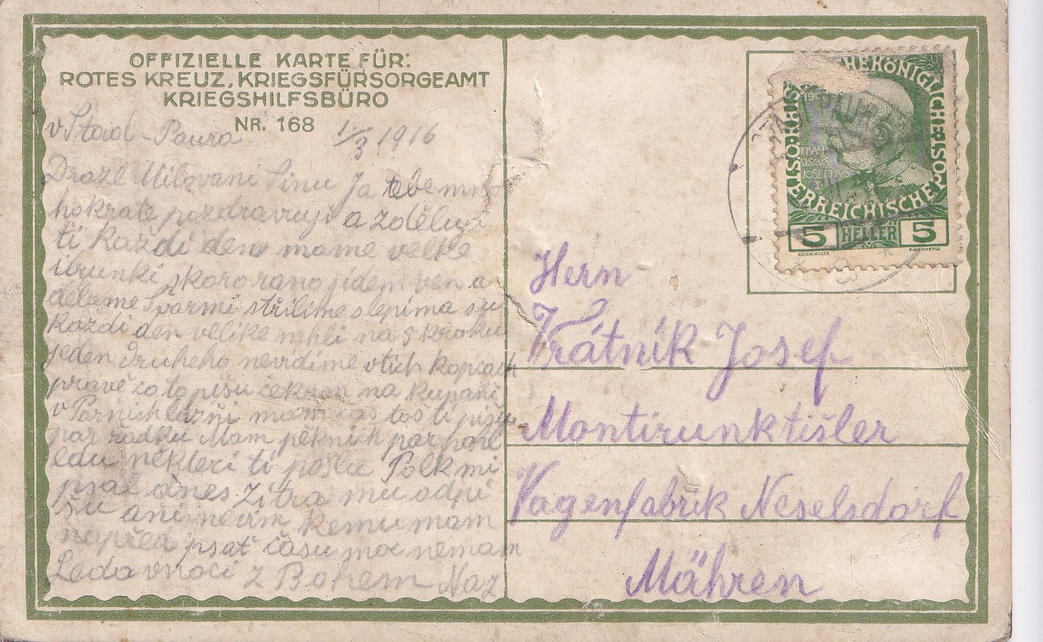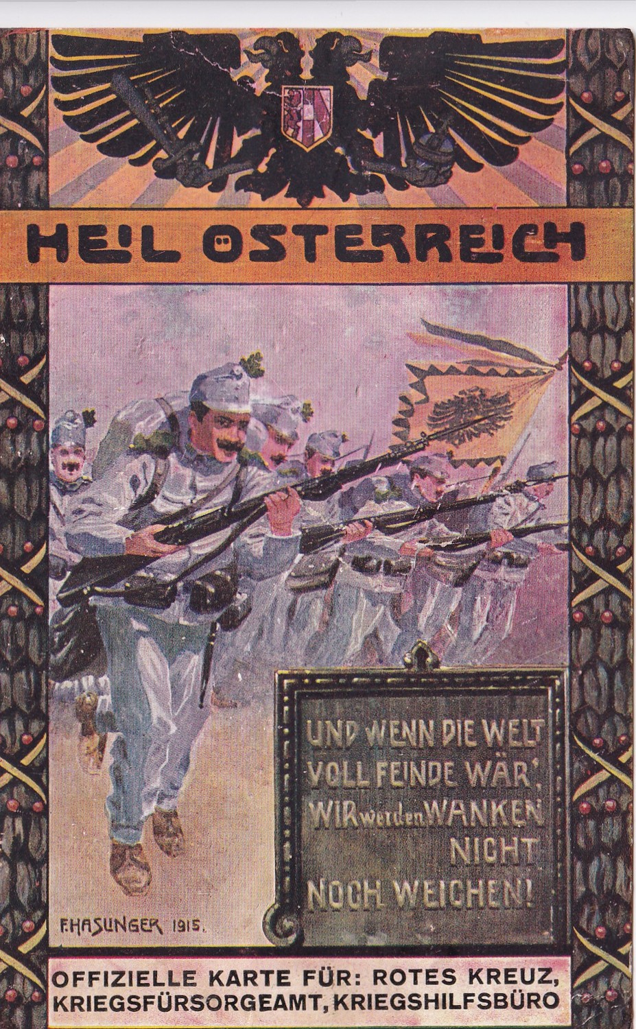 (hhk 84) MF prošlá poštou, r.1916. Pohlednice pro Červený kříž, úřad válečné pomoci. Propagační, dvouhlavá orlice, vojáci, zbraně, erb.