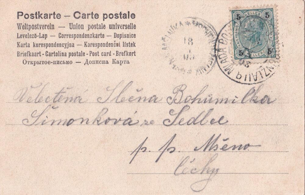 25 (hhf) Rozměr 14 x 9 cm. Razítko Mladá Boleslav, adresát Mšeno.