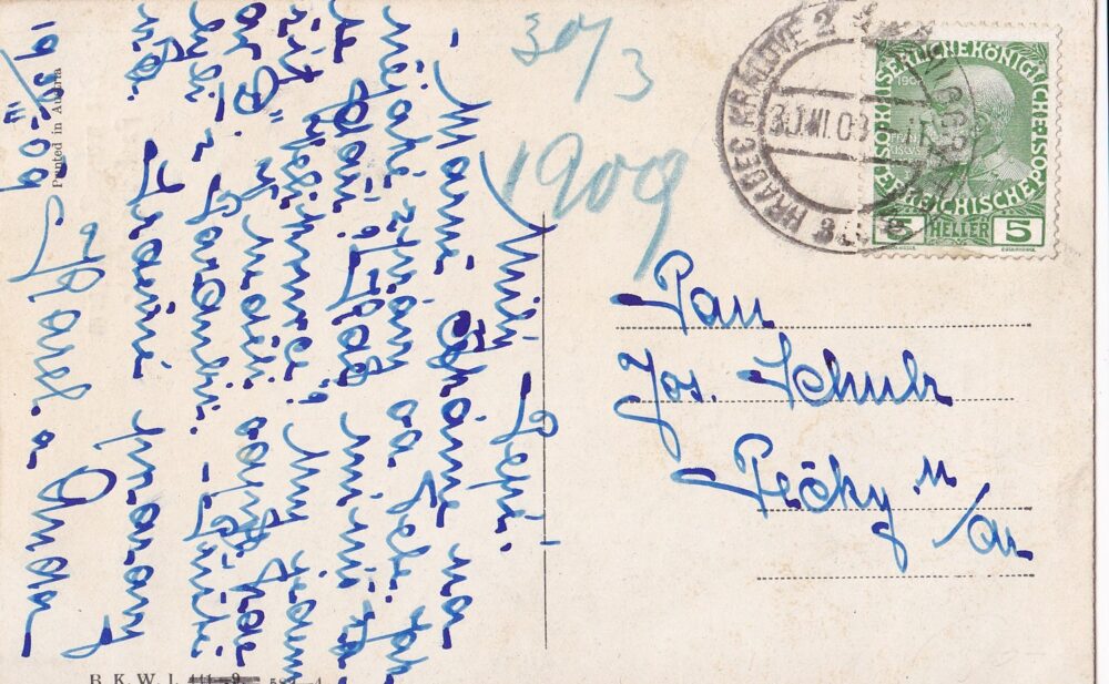 (hhk 53) MF, prošlá poštou. Adresát Pečky, r.1909