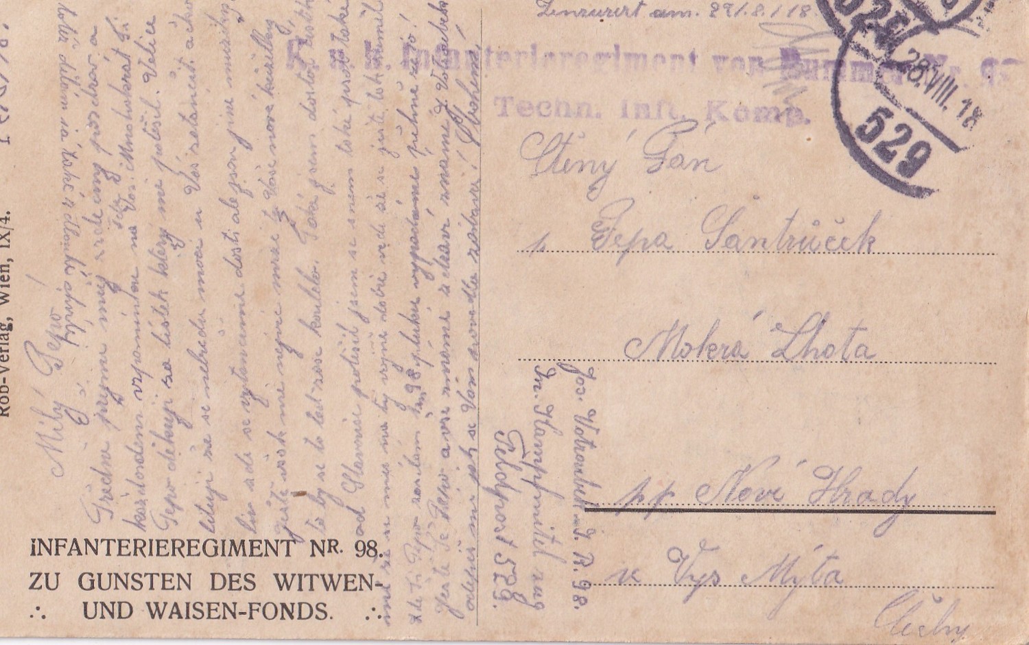 (hhk 64) MF, prošlá počtou. Adresát Mokrá Lhota, Nové Hrady u Vysokého Mýta, r.1918. Razítka. Ve prospěch fondu vdov a sirotků. Pěší pluk č. 98