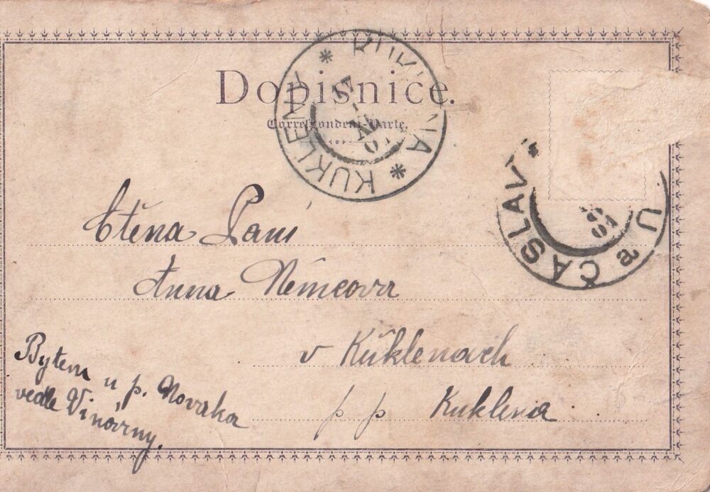 36 (hhf) Rozměr 14 x 9 cm. Adresováno v Kuklenách, p.Kukleny. Razítko Čáslav.