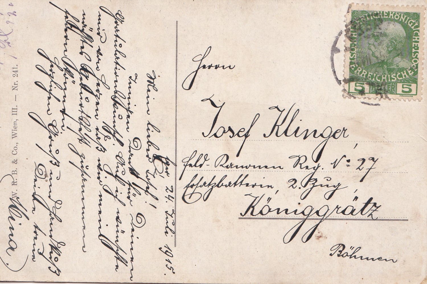 (hhk 10) MF, prošlá poštou. Adtresát Hradec Králové, r. 1915