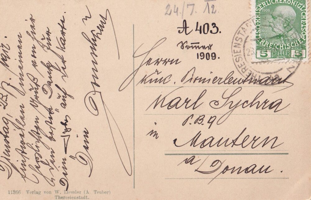 19 (hhf) Rozměr 14 x 9 cm. adresát Mautern an der Donau, razítko Theresienstadt – Terezín 1909