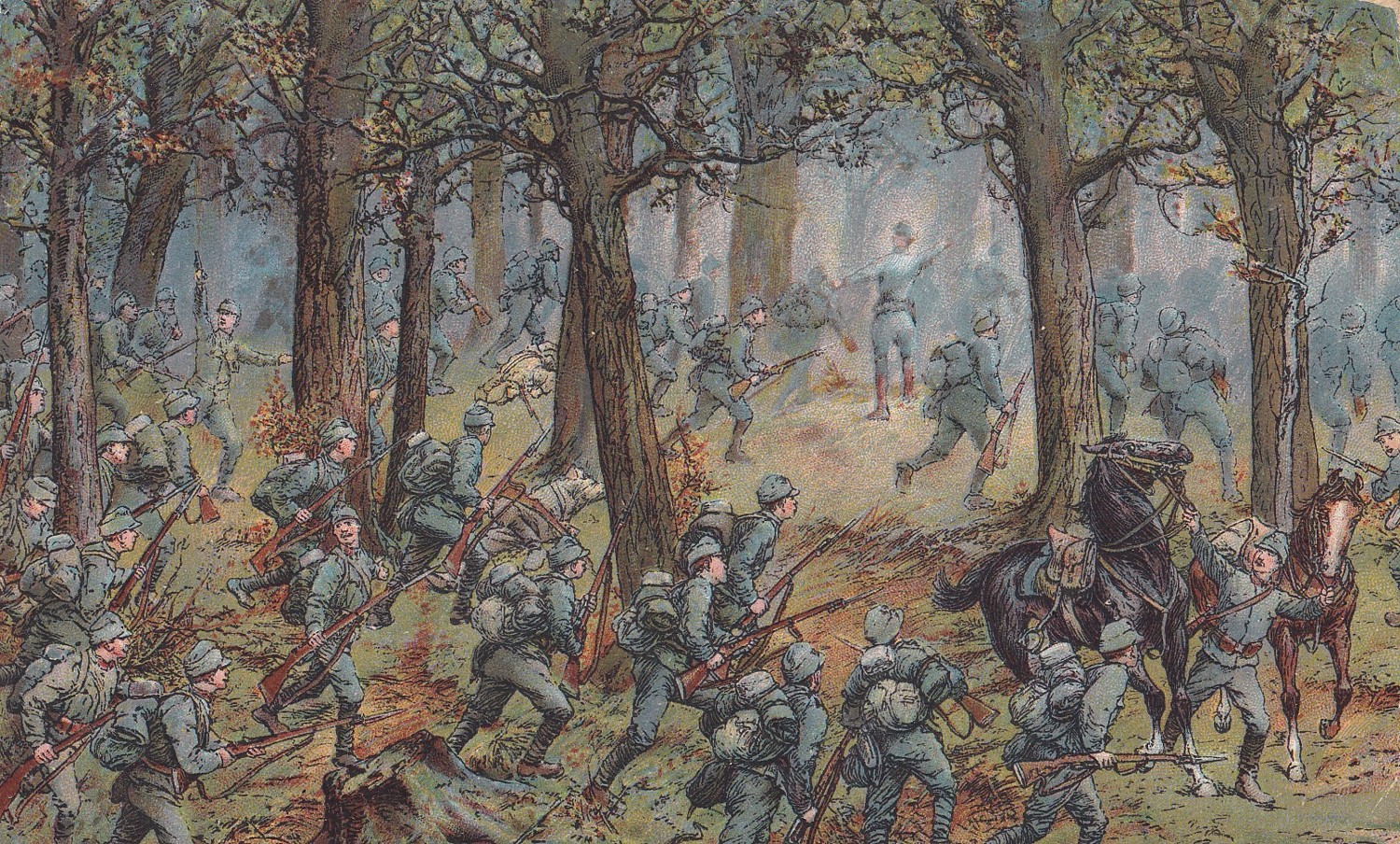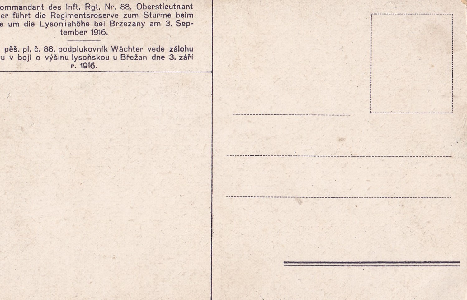 (hhk 18) MF, pohlednice čistá. Velitel pěš.pluku č.88, podplukovník Wächter vede zálohu k útoku v boji o výšinu lysoňskou u Břežan dne 3.září r.1916