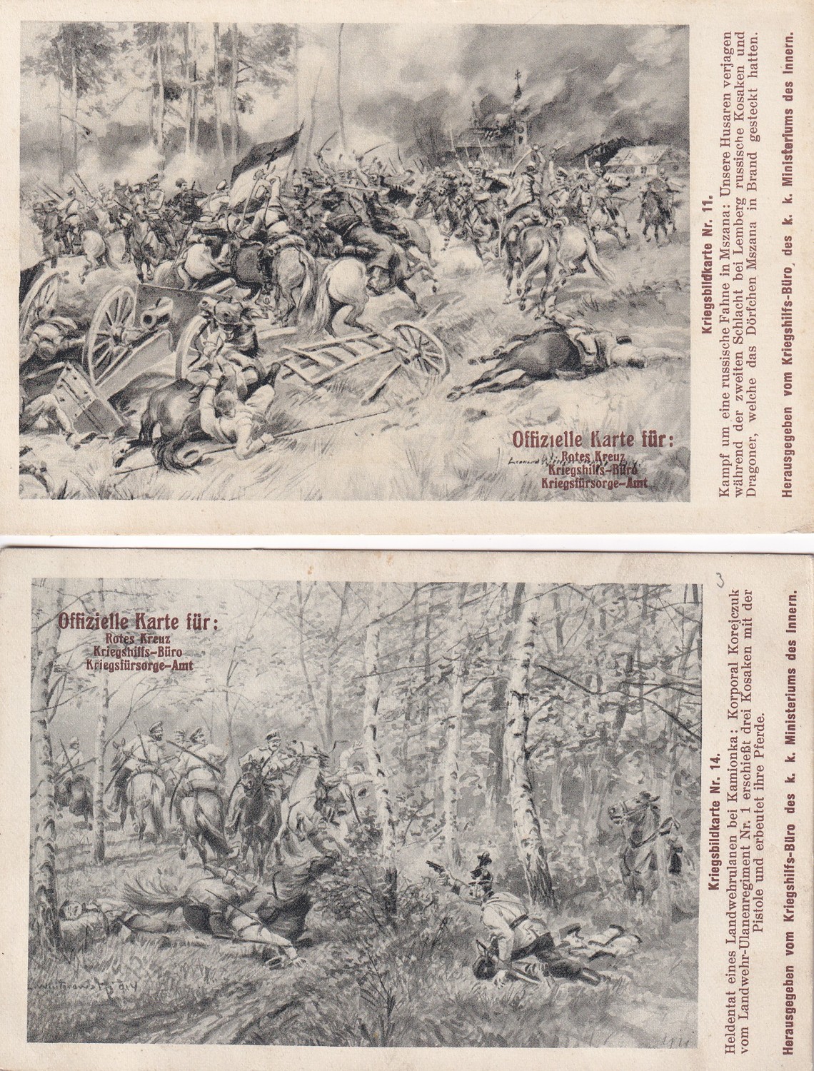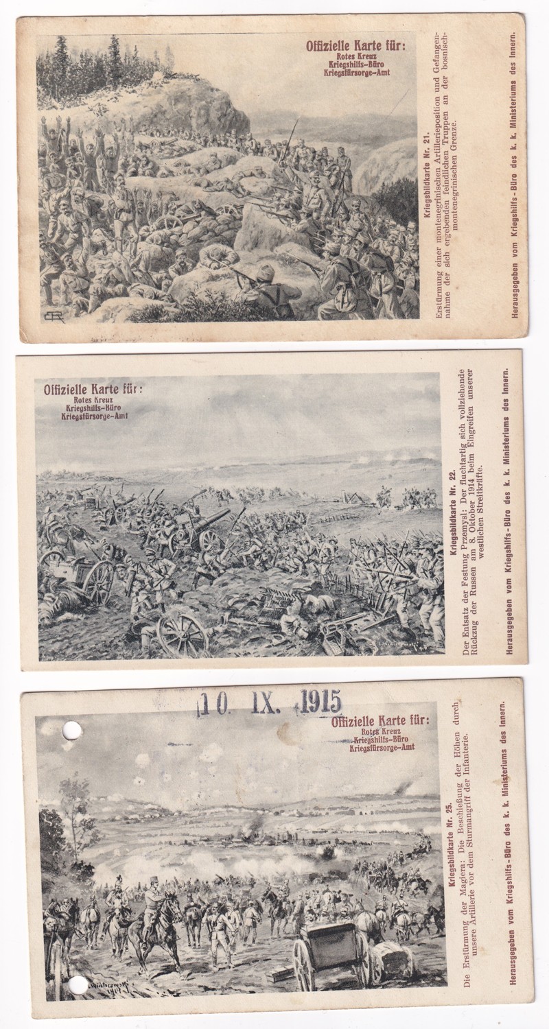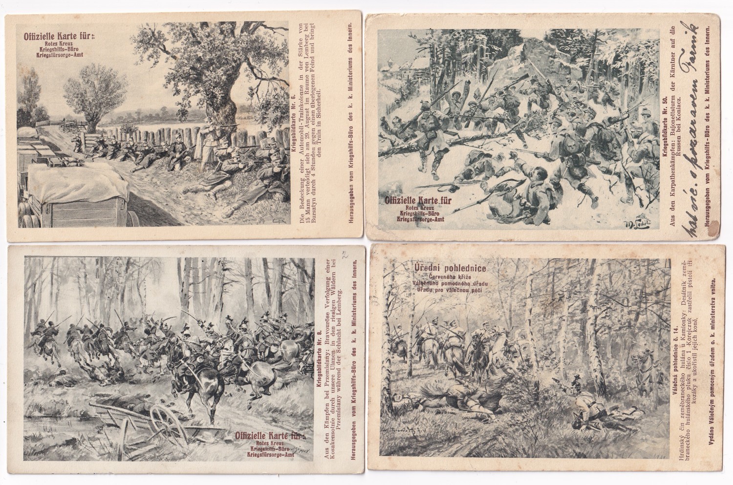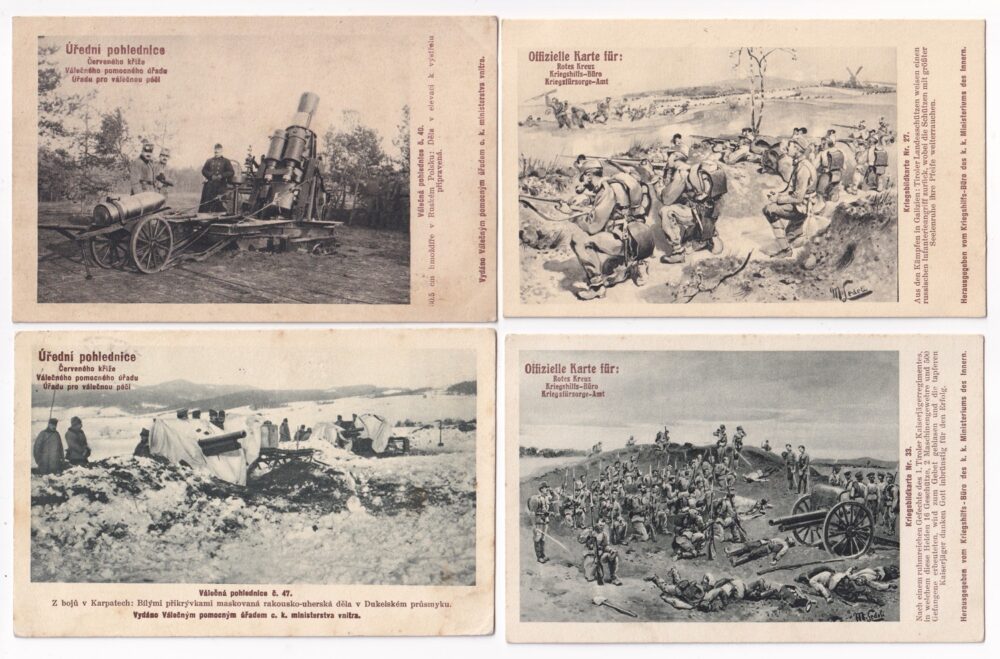 (hhk 3) MF, Úřední pohlednice Červeného kříže – Válečného pomocného úřadu – Úřadu pro válečnou péči. 11 x pohlednice neprošlá poštou. 6 x pohlednice prošlá poštou. Adresát c.k. berní asistent, Vodňany r. 1917. Razítko Bludov, adresát Brno r.1915. Adresát c.k.vrchní správce hejtmana v Jilemnici, r.1915. Adresát Česká Lípa, r.1915. Vojáci na frontě, bitvy, bojiště, pušky, zbraně, výzbroj, výstroj, vojenská technika, děla, kulomety, kozáci, hulánský pluk, razítka, WWI…Vydáno Válečným pomocným úřadem c.k. ministerstva vnitra.