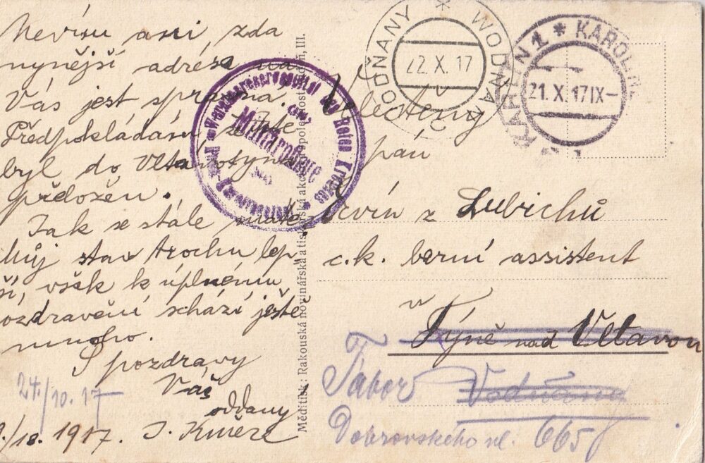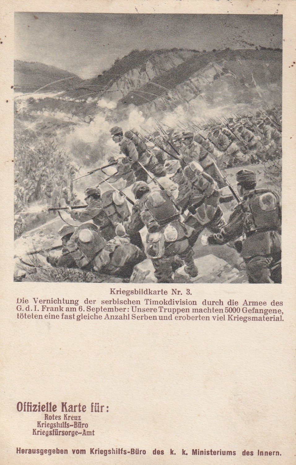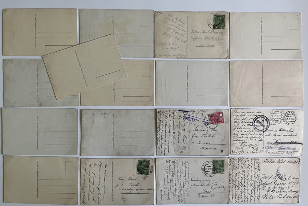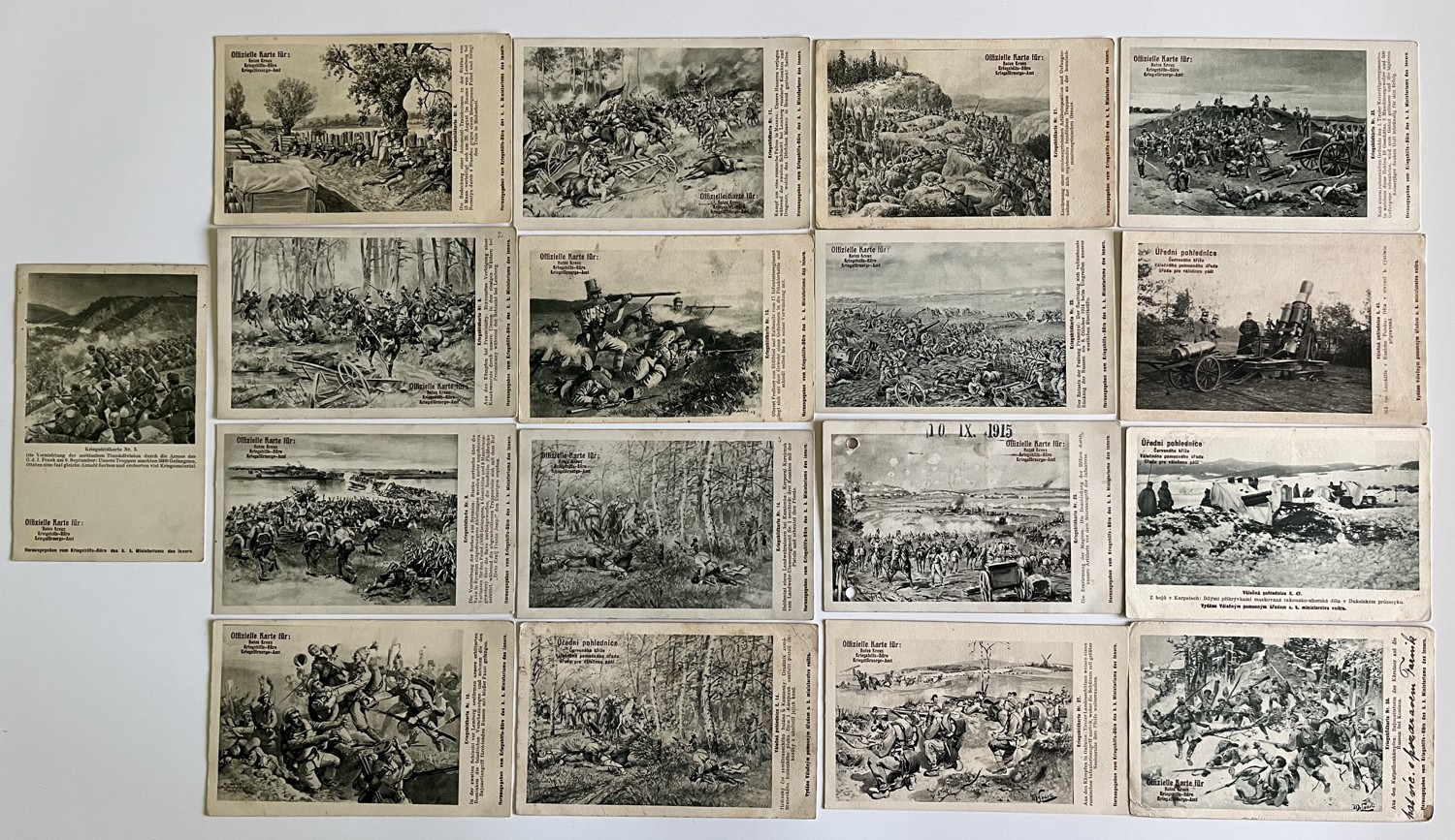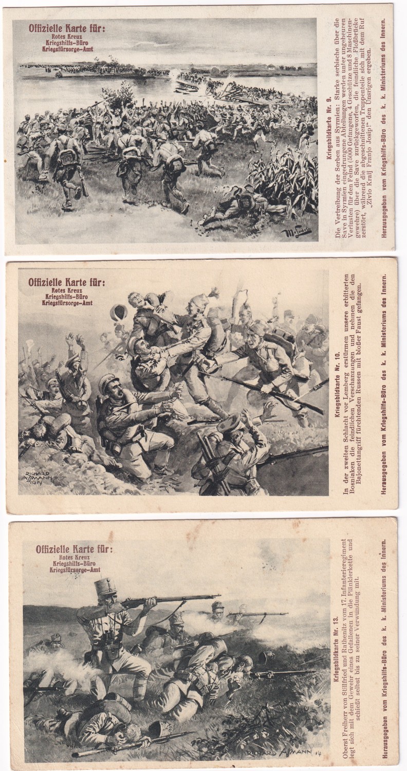 (hhk 3) MF, Úřední pohlednice Červeného kříže – Válečného pomocného úřadu – Úřadu pro válečnou péči. 11 x pohlednice neprošlá poštou. 6 x pohlednice prošlá poštou. Adresát c.k. berní asistent, Vodňany r. 1917. Razítko Bludov, adresát Brno r.1915. Adresát c.k.vrchní správce hejtmana v Jilemnici, r.1915. Adresát Česká Lípa, r.1915. Vojáci na frontě, bitvy, bojiště, pušky, zbraně, výzbroj, výstroj, vojenská technika, děla, kulomety, kozáci, hulánský pluk, razítka, WWI…Vydáno Válečným pomocným úřadem c.k. ministerstva vnitra.