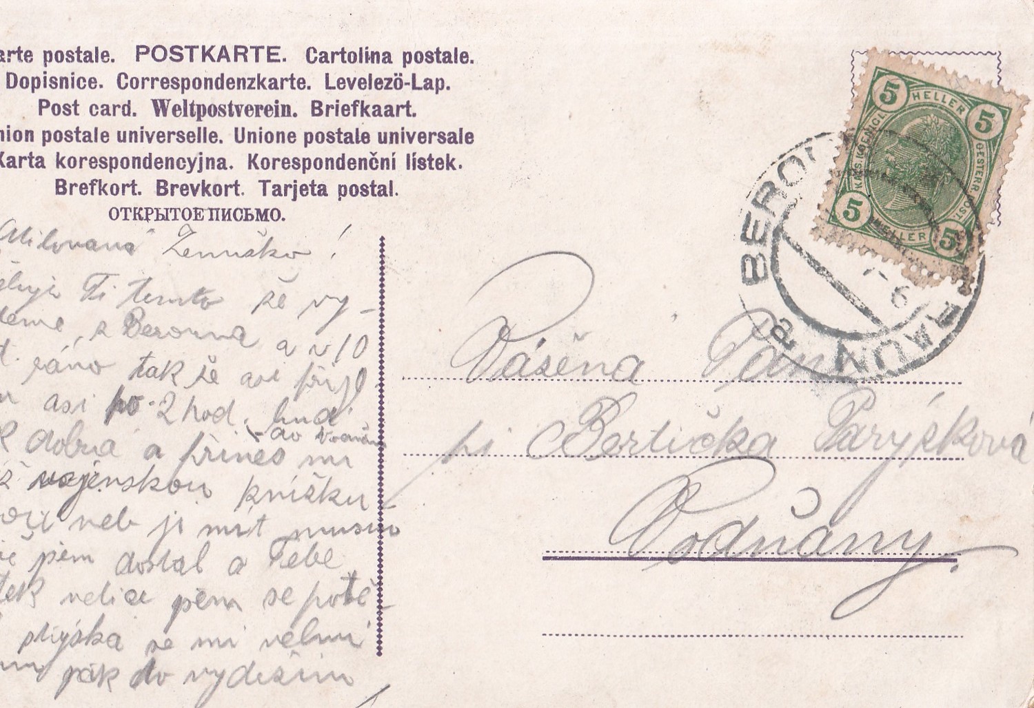 34 (hhf) Rozměr 14 x 9 cm. Adresováno Vodňany, razítko Beroun.