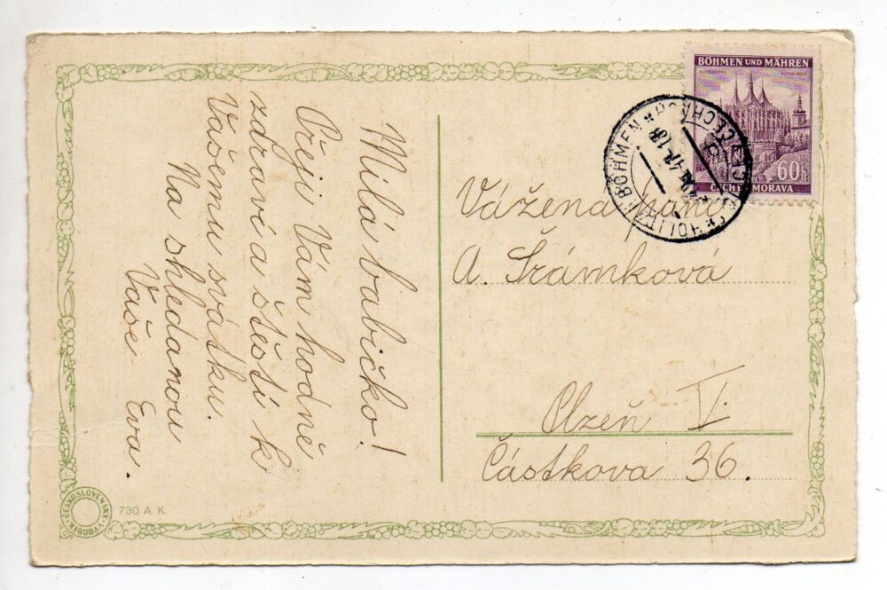 (JL-99) Rozměr: 9×14 cm; Prošlý se známkou, razítko nečitelné, adresováno: A. Šrámková, Plzeň;