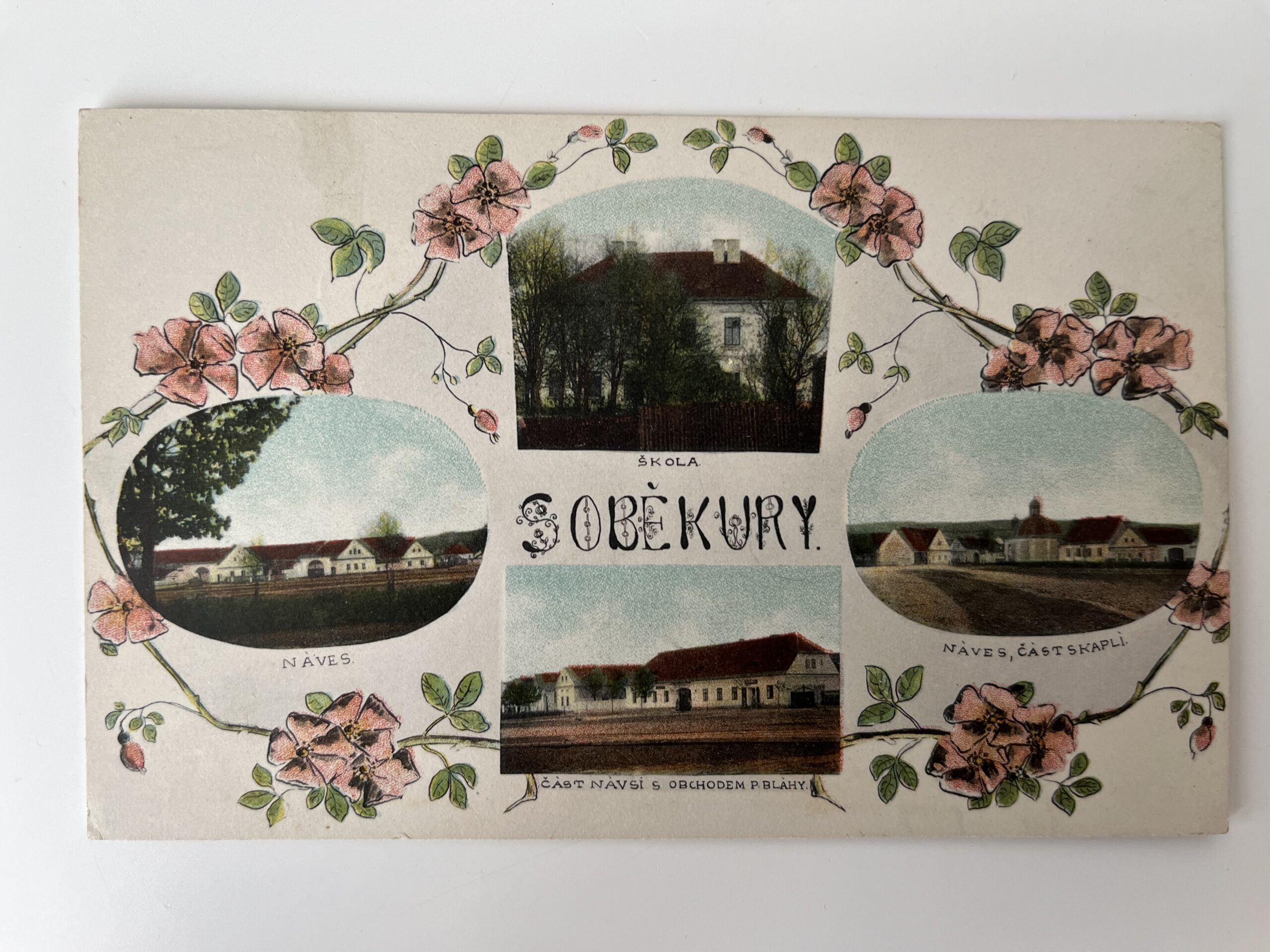 (Plzeň jih-13) Pohlednice malý formát, neprošlá poštou. Soběkury. Koláž – Škola. Náves, část s kaplí. Náves s obchodem P. Bláhy. Náves.