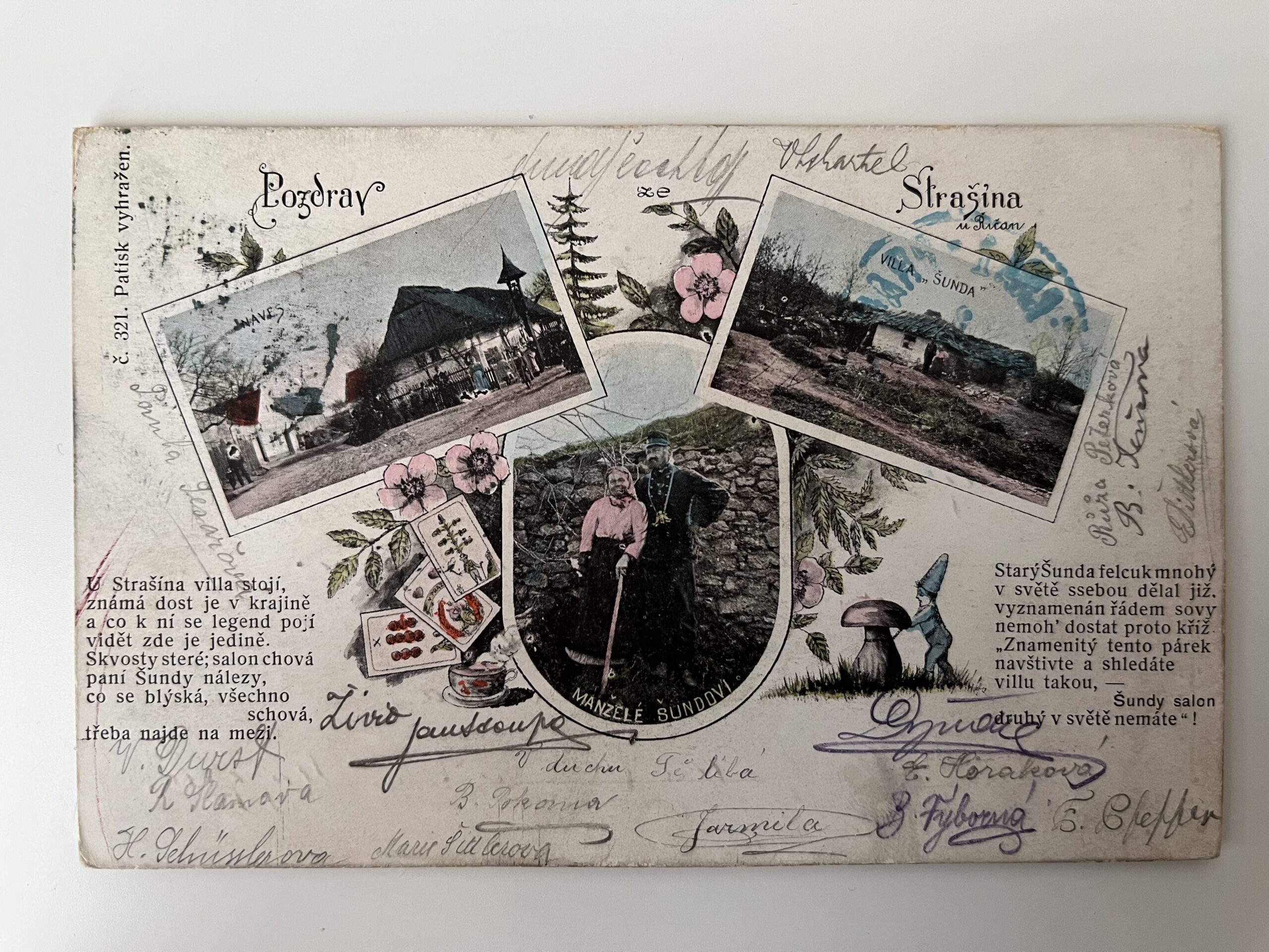 Pohlednice Strašín koláž – manželé Šundovi, náves Praha východ RU