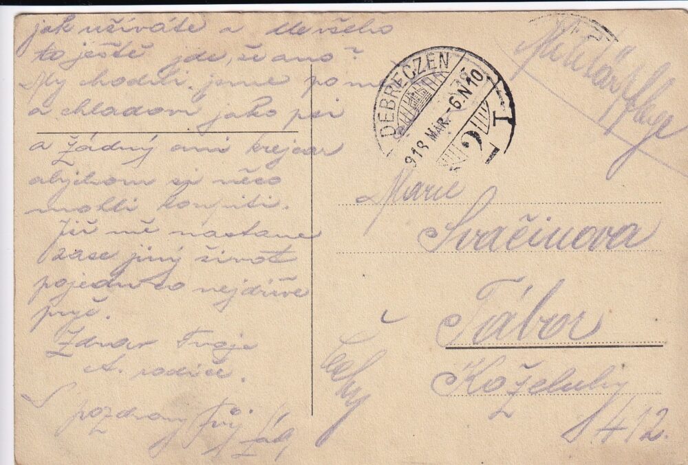 (hhk 79) MF prošlá poštou. Adresát Koželuhy, Tábor r.1918