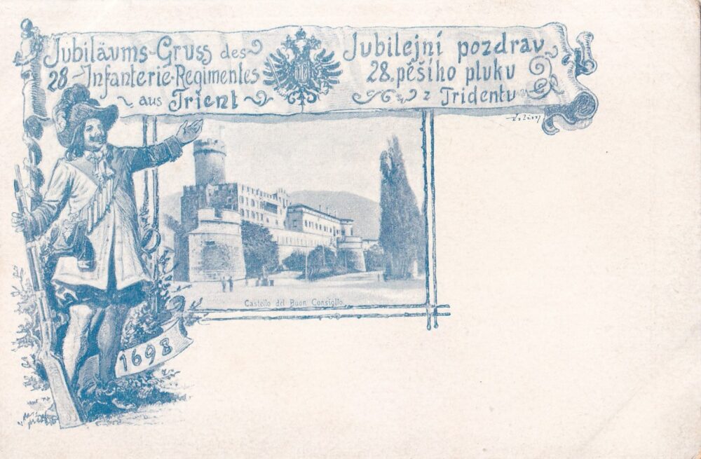 32 (hhf) Rozměr 14 x 9 cm. Pohlednice Jubilejní pozdrav z 28.pěšího pluku Trident, Buonconsiglio – Hrad v Trentu, Itálie. Čistá pohlednice