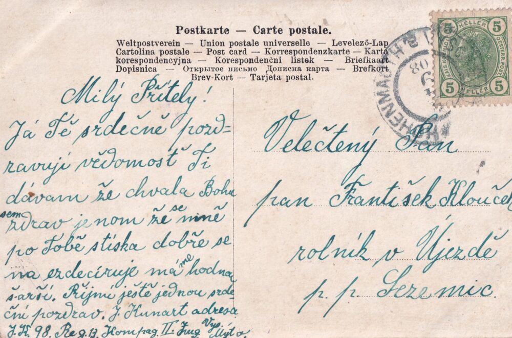 65 (hhf) Rozměr 14 x 9 cm. Adresát rolník v Újezdě, p. Sezemice
