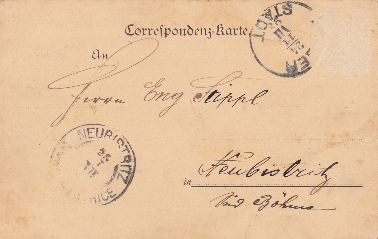 38 (hhf) Rozměr 14 x 9 cm. Razítko Neubistritz – Nová Bystřice, Eger – Stadt, Cheb. Adresováno Neubistritz