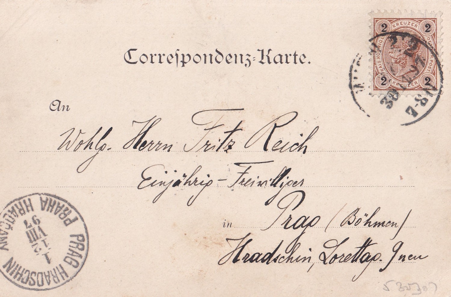 40 (hhf) Rozměr 14 x 9 cm. Adresováno Praha Hradčany, razítko 30.11.1897, razítko Praha Hradčany 1.12.1897
