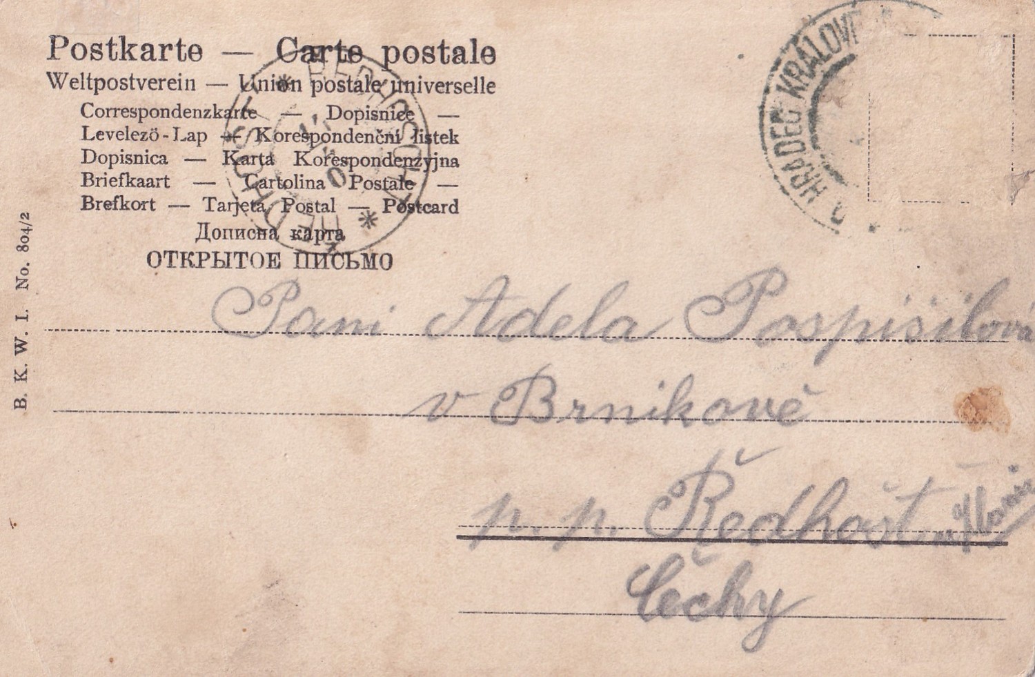 44 (hhf) Rozměr 14 x 9 cm. Adresováno Ředhošť. razítko Hradec Králové