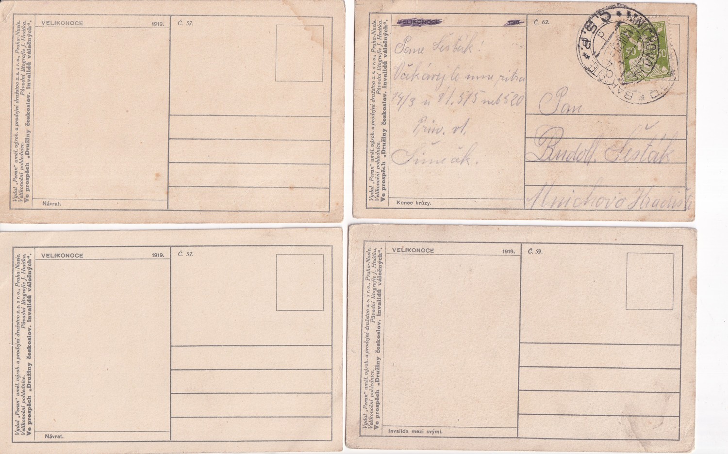 112 (hhe) Rozměr 14 x 9 cm. Pohlednice Velikonoce – Návrat. Invalida mezi svými. Konec hrůzy. Adresováno: Mnichovo Hradiště.