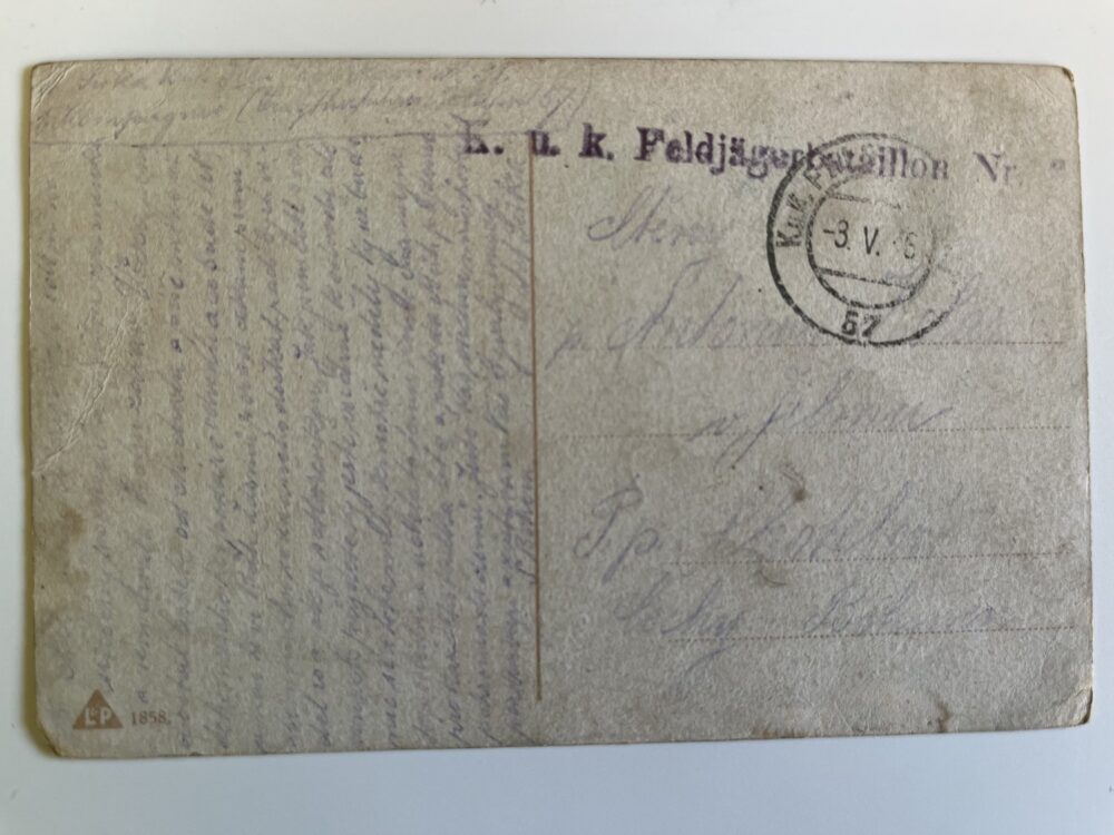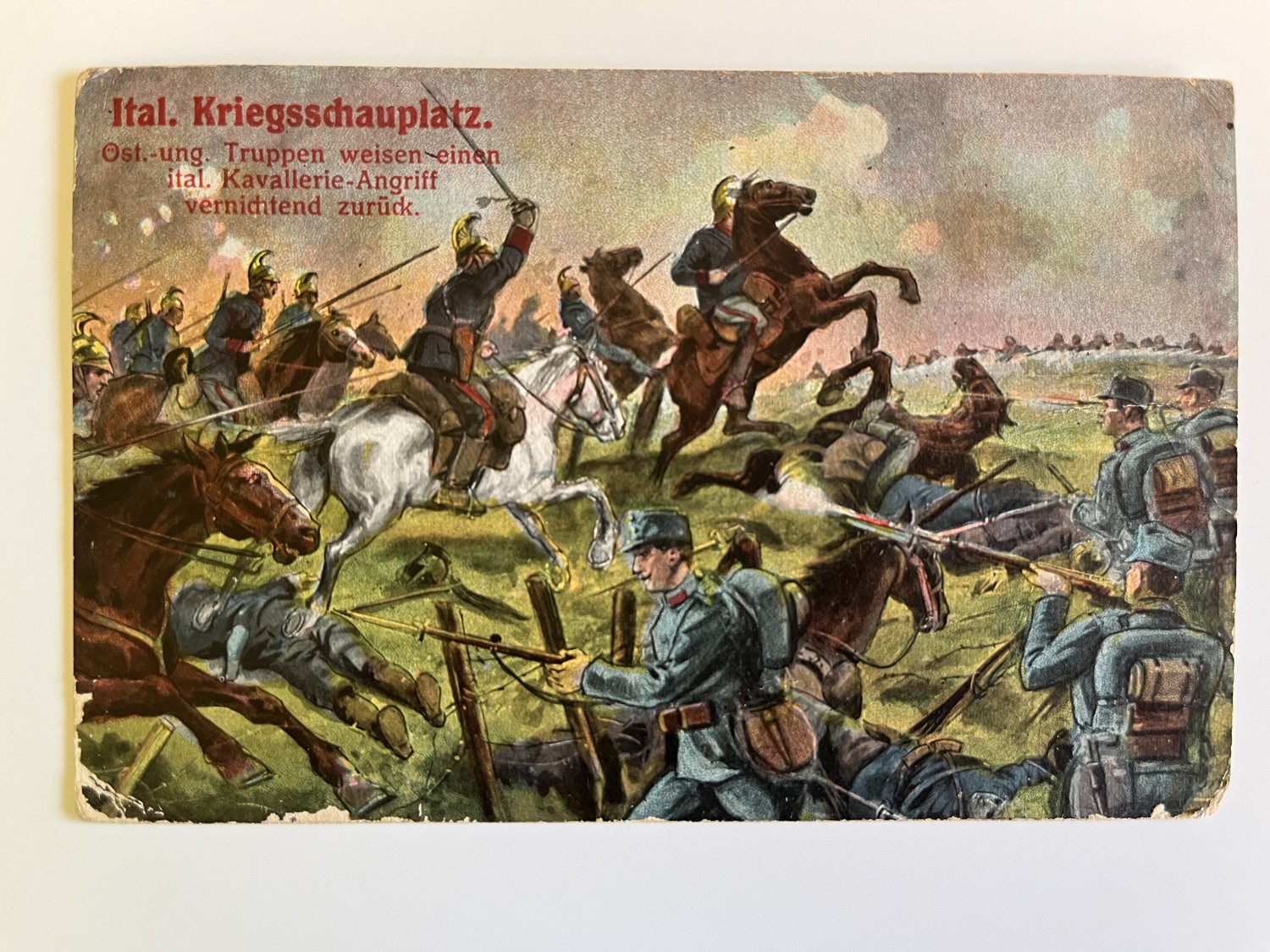 (hhl 59) MF prošlá, 1916. Razítko. Italské válečné divadlo. Východomaďarská vojska odrazila útok italské jízdy s ničivým účinkem