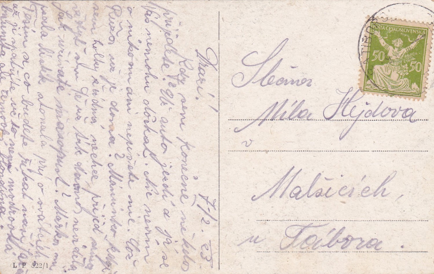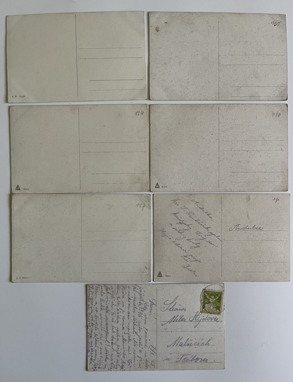 (hhk 2) MF, 6 x neprošlá poštou. 1 x prošlá poštou. Razítko Ratiboř. Adresát Malšice, okres Tábor, r.1923